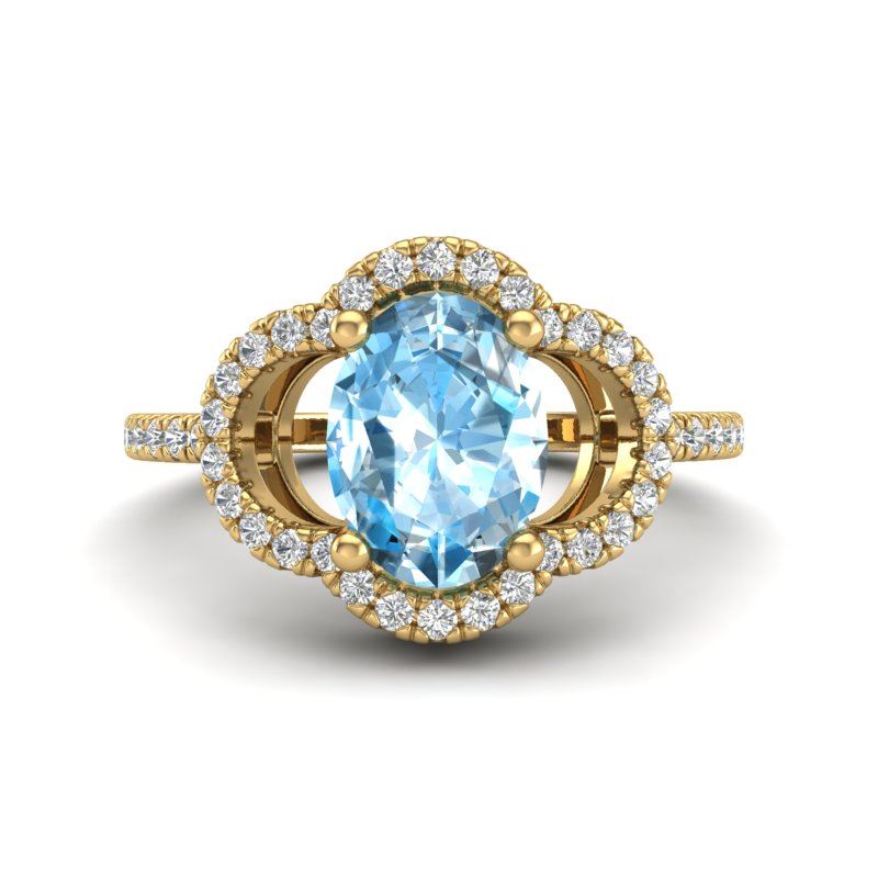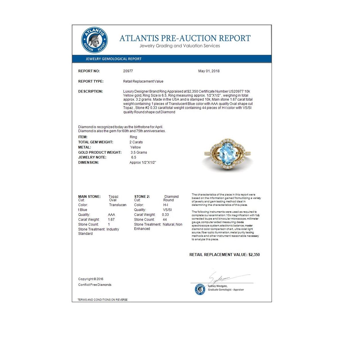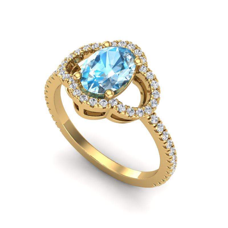 REF-32M9H -20977 ---- 2 CTW Topaz & Micro Pave VS/SI Diamond Ring 10K Yellow Gold ---- Luxury Designer Brand Ring Appraised at $2,350 Certificate Number US20977 10k Yellow gold, Ring Size is 6.5, Ring measuring approx. 1/2"X1/2" , weighing in total approx. 3.2 grams. Made in the USA and is stamped 10k, Main stone 1.67 carat total weight containing 1 pieces of Translucent Blue color with AAA quality Oval shape cut Topaz , Stone #2 0.33 carat total weight containing 44 pieces of H-I color with VS/SI quality Round shape cut Diamond