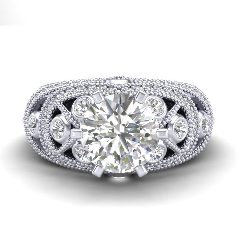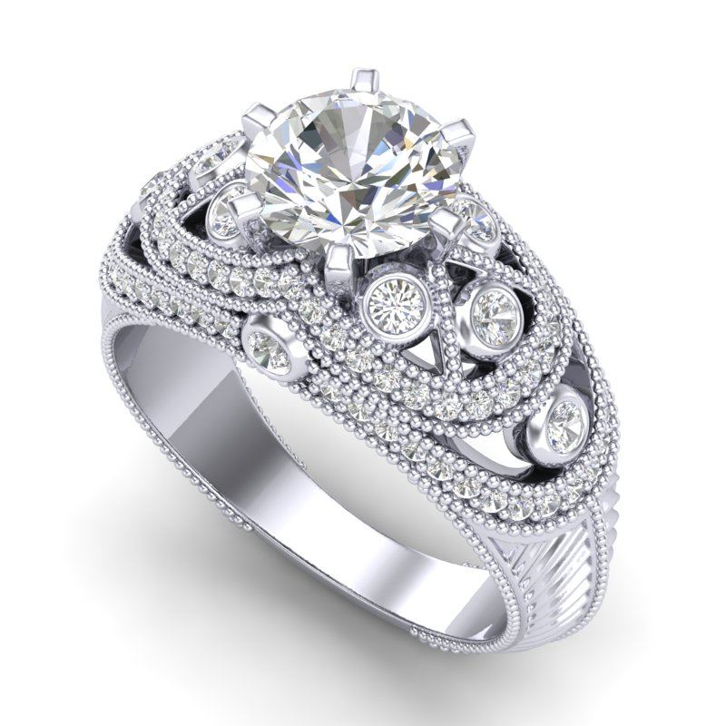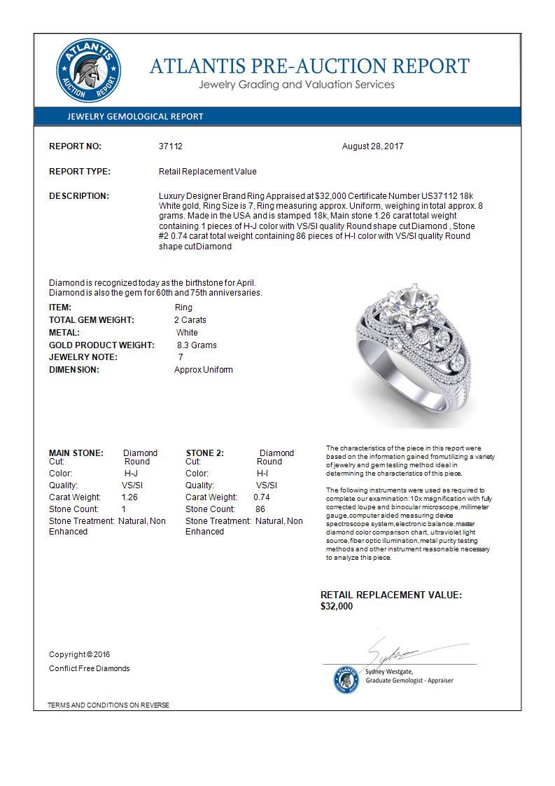 37112 - REF-581A8V ---- 2 CTW VS/SI Diamond Solitaire Art Deco Ring 18K White Gold ---- Luxury Designer Brand Ring Appraised at $32,000 Certificate Number US37112 18k White gold, Ring Size is 7, Ring measuring approx. Uniform, weighing in total approx. 8 grams. Made in the USA and is stamped 18k, Main stone 1.26 carat total weight containing 1 pieces of H-J color with VS/SI quality Round shape cut Diamond , Stone #2 0.74 carat total weight containing 86 pieces of H-I color with VS/SI quality Round shape cut Diamond
