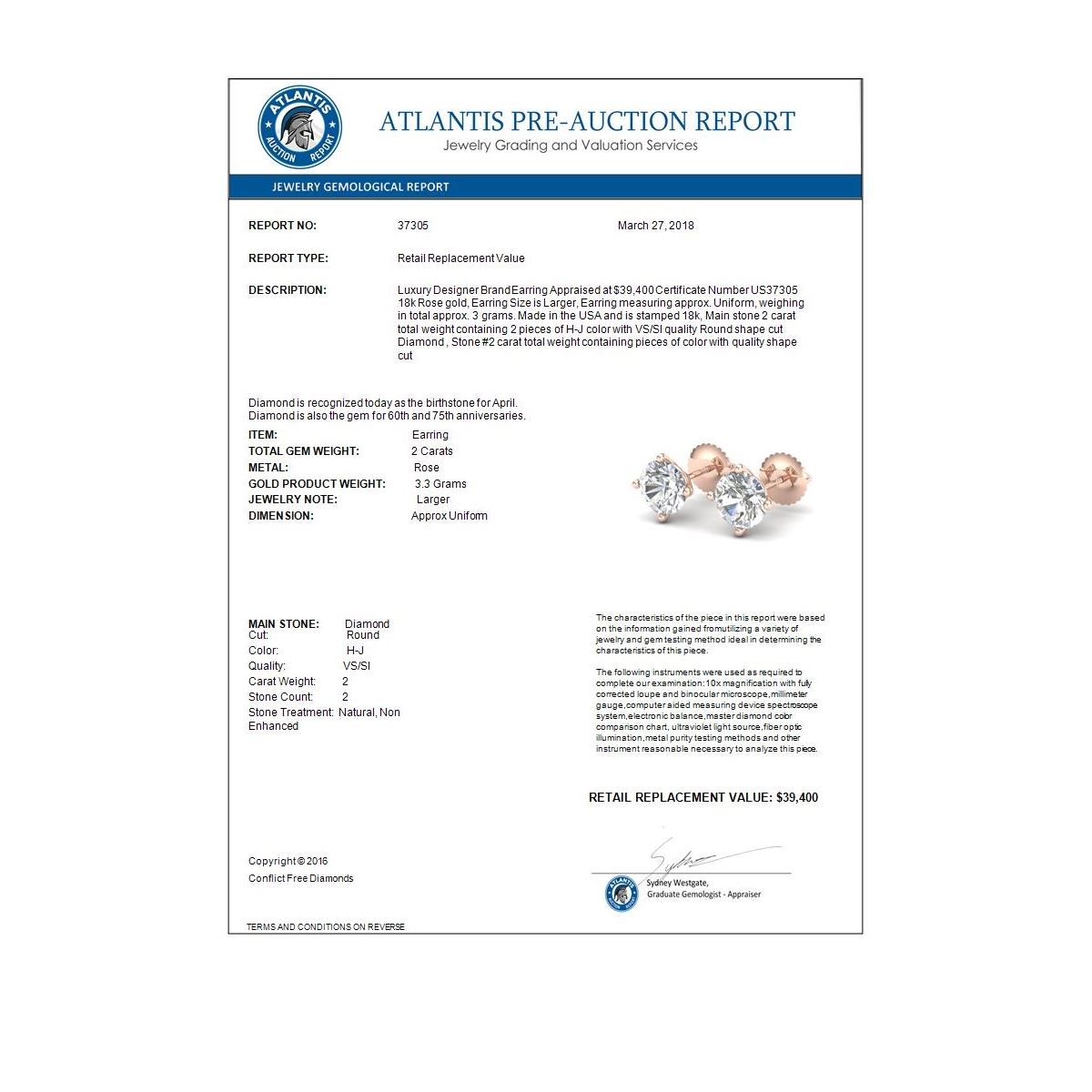 REF-591X2T -37305 ---- 2 CTW VS/SI Diamond Solitaire Art Deco Stud Earrings 18K Rose Gold ---- Luxury Designer Brand Earring Appraised at $39,400 Certificate Number US37305 18k Rose gold, Earring Size is Larger, Earring measuring approx. Uniform, weighing in total approx. 3 grams. Made in the USA and is stamped 18k, Main stone 2 carat total weight containing 2 pieces of H-J color with VS/SI quality Round shape cut Diamond , Stone #2 carat total weight containing pieces of color with quality shape cut