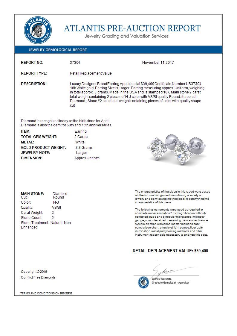 37304 - REF-591M2F ---- 2 CTW VS/SI Diamond Solitaire Art Deco Stud Earrings 18K White Gold ---- Luxury Designer Brand Earring Appraised at $39,400 Certificate Number US37304 18k White gold, Earring Size is Larger, Earring measuring approx. Uniform, weighing in total approx. 3 grams. Made in the USA and is stamped 18k, Main stone 2 carat total weight containing 2 pieces of H-J color with VS/SI quality Round shape cut Diamond , Stone #2 carat total weight containing pieces of color with quality shape cut