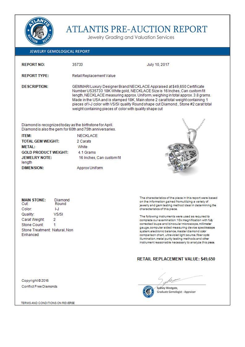 2 CTW VS/SI Diamond Solitaire Necklace 18K White Gold ---- Luxury Designer Brand NECKLACE Appraised Retail Price at $49,650 ---- SKU Number US35733 18K White gold NECKLACE Size is 16 Inches, Can custom fit length, NECKLACE measuring approx. Uniform, weighing in total approx. 3.8 grams. Made in the USA and is stamped 18K, Main stone 2 carat total weight containing 1 pieces of I-J color with VS/SI quality Round shape cut Diamond , Stone #2 carat total weight containing pieces of color with quality shape cut