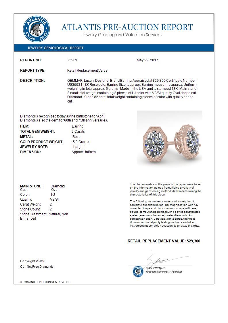 2 CTW VS/SI Oval Cut Diamond Stud Earrings 18K Rose Gold ---- Luxury Designer Brand Earring Appraised Retail Price at $29,300 ---- SKU Number US35981 18K Rose gold Earring Size is Larger, Earring measuring approx. Uniform, weighing in total approx. 5 grams. Made in the USA and is stamped 18K, Main stone 2 carat total weight containing 2 pieces of I-J color with VS/SI quality Oval shape cut Diamond , Stone #2 carat total weight containing pieces of color with quality shape cut