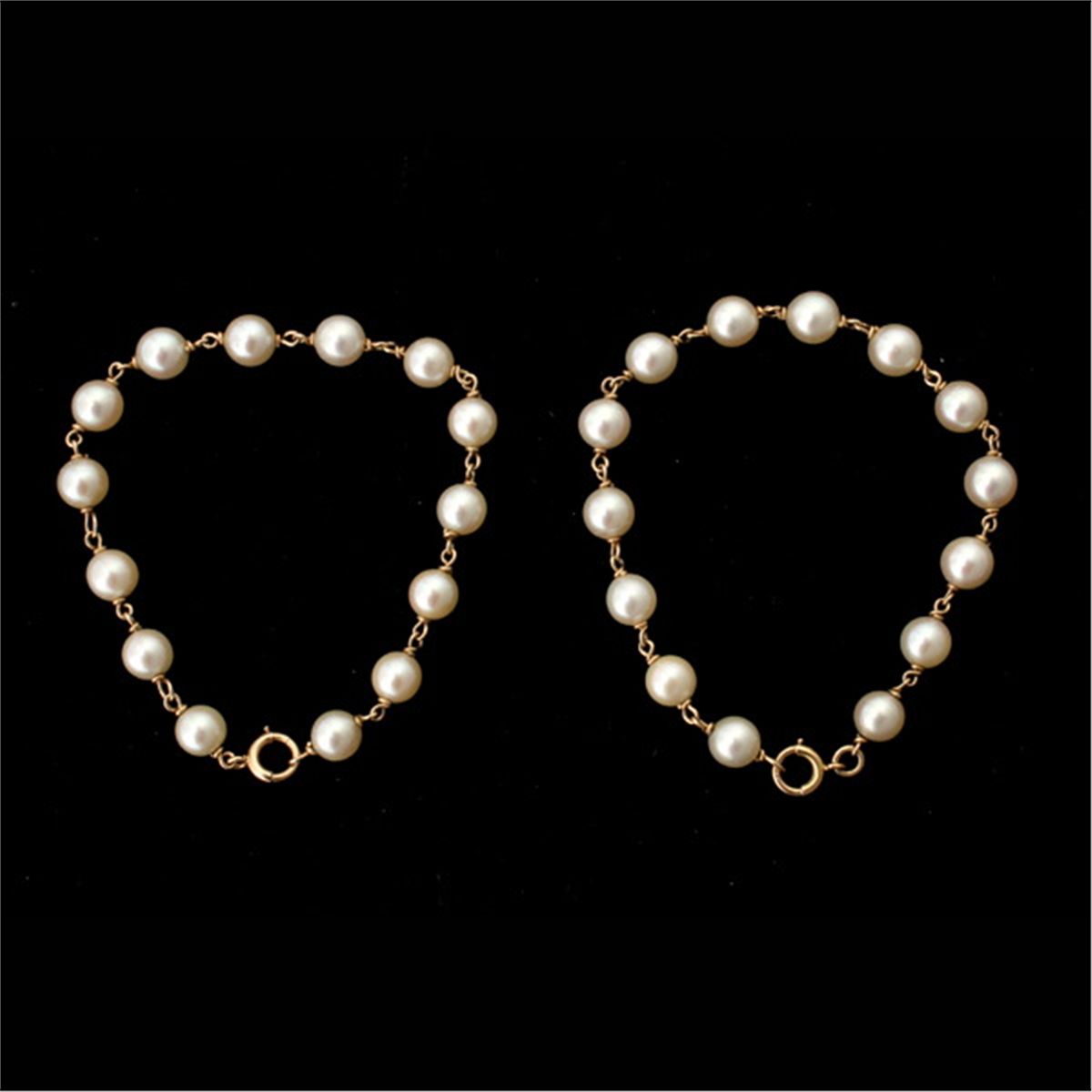 COLLECTION OF TWO CULTURED PEARL, 14K YELLOW GOLD BRACELETS. Each bracelet features fourteen cultured pearls measuring approximately 7.00 mm to 7.50 mm, completed by a 14k yellow gold spring ring clasp.