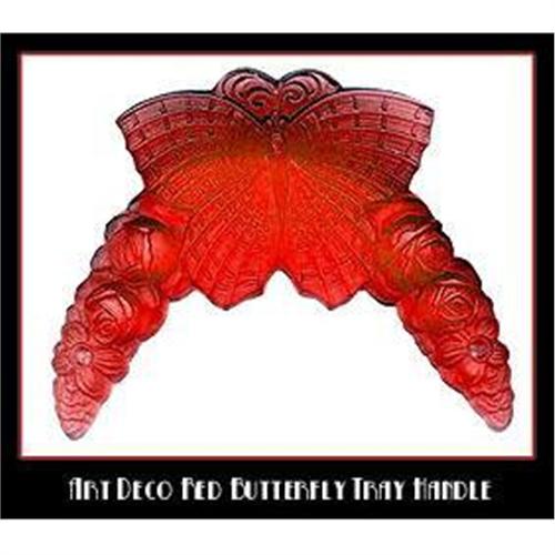 If you are REALLY interested in this item, please note that for Ebay Live Auction only bids at or above $90 will be successful and meet our reserve. As stated by Ruth Forsythe (Czechoslovakian Collectors Guild International, Volume 1, No.3), Czech Vanity trays are SCARCE commodity. Up for Auction is GORGEOUS pair of Czech vanity tray handles, depicting red acid etched 3 dimensional relief butterfly. We secured few of these handles 8 years ago and had custom made oval mirror vanity tray. All trays are sold out ($295), but you can still get the handles and design your own vanity piece. It was a challenge to capture 3 dimensional beauty which eye so easily perceives–breathtaking! The handles were made from the original 1930's mold by our Boheme Studio in Czech Republic, not available anywhere else, we are the only source in the U.S.A. Size of the handles: 6-1/2"L x 5"H x 3/4" thick. Pictured tray size was 18"L x 9"W. MINT condition, no chips, cracks or "flea bites".