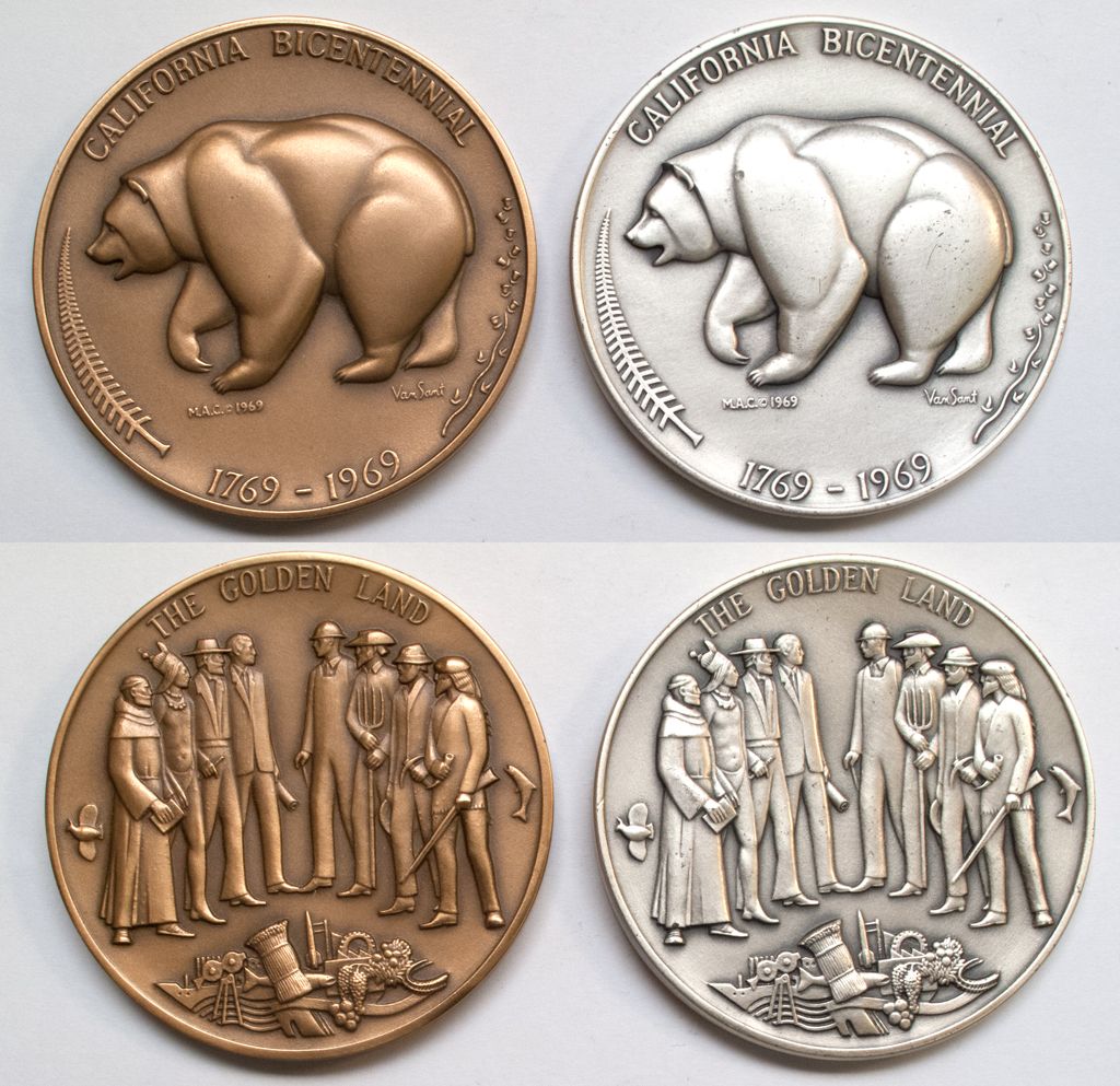 California Bicentennial 1769-1969. 1 brass, 1 white metal.City: County: State: CADate: 1969