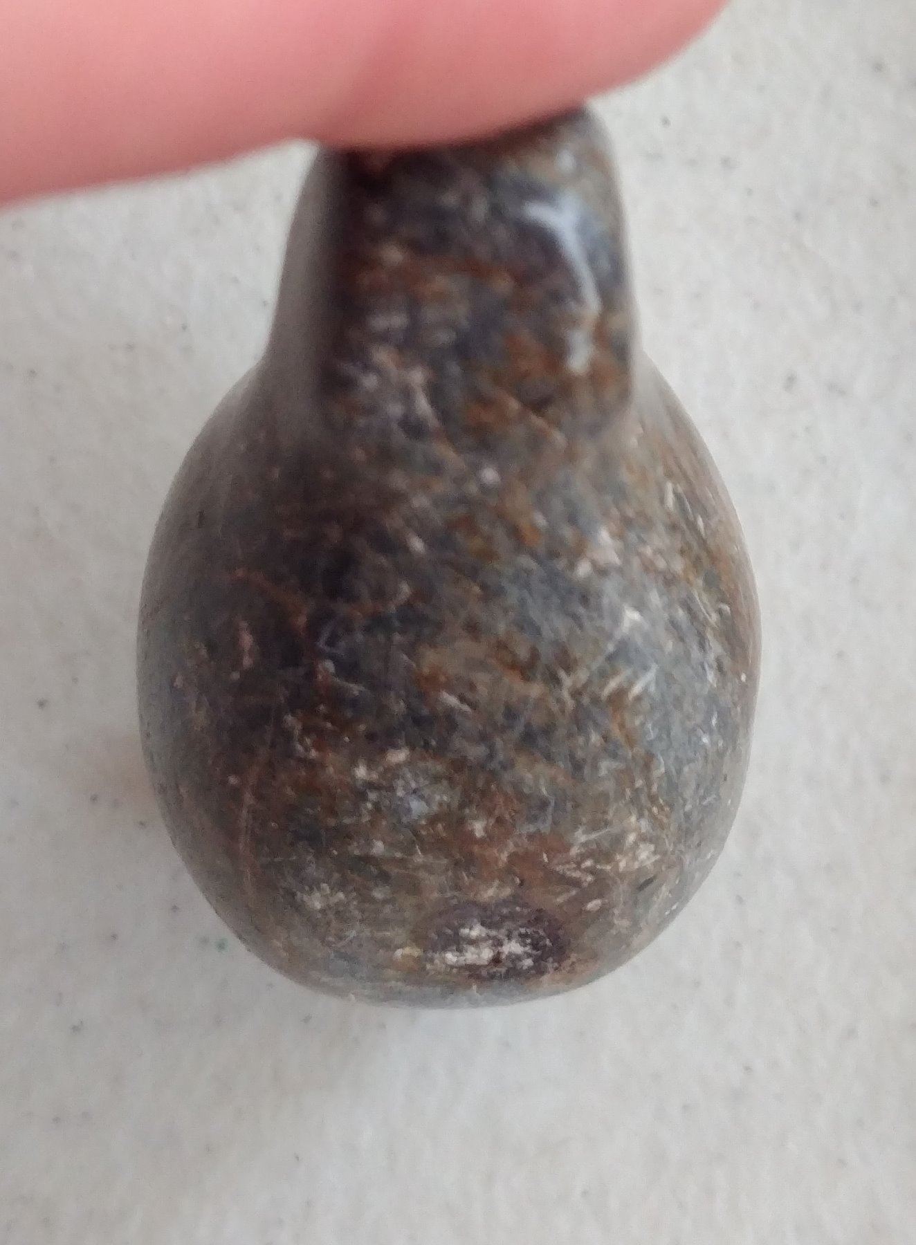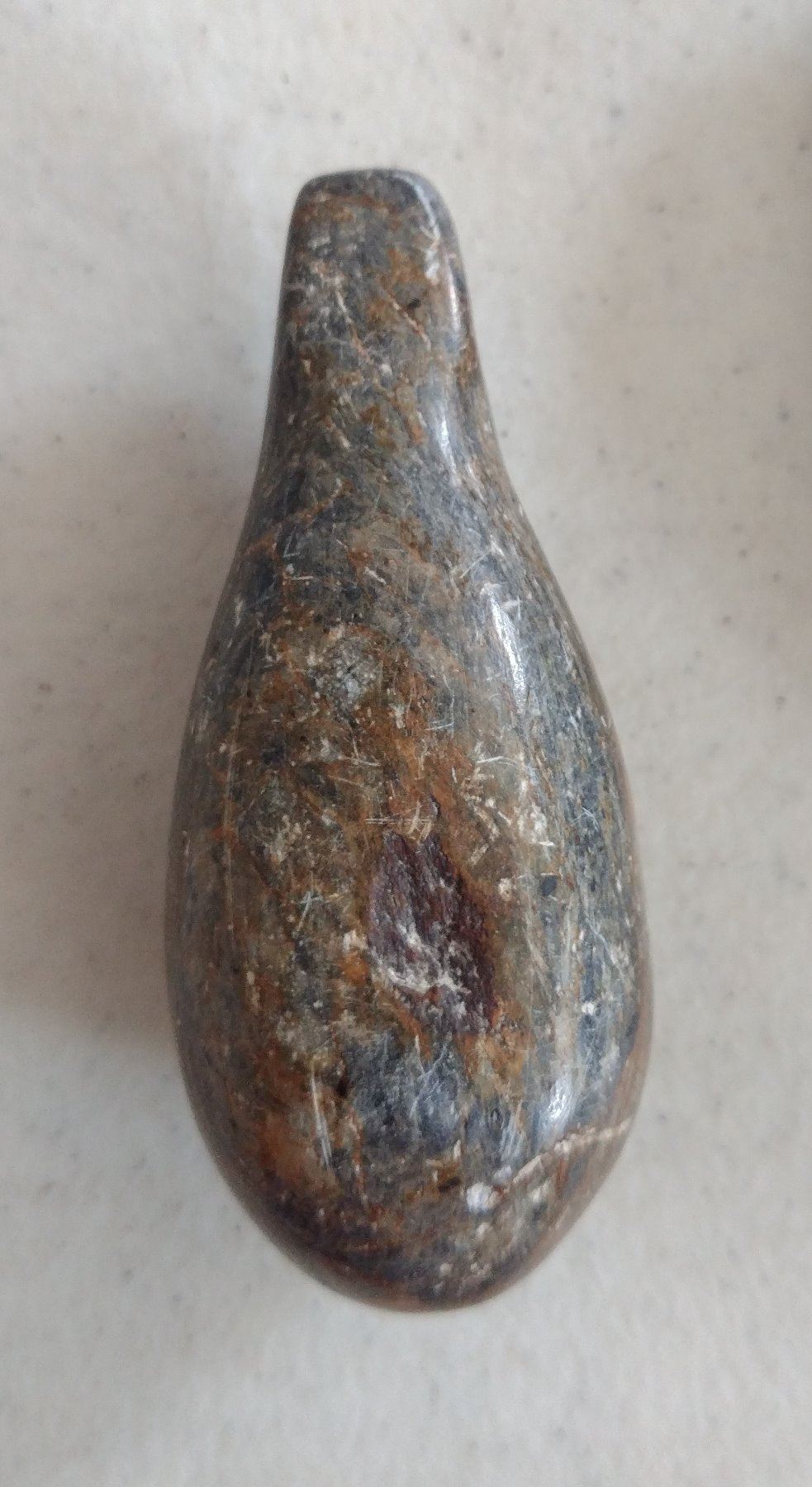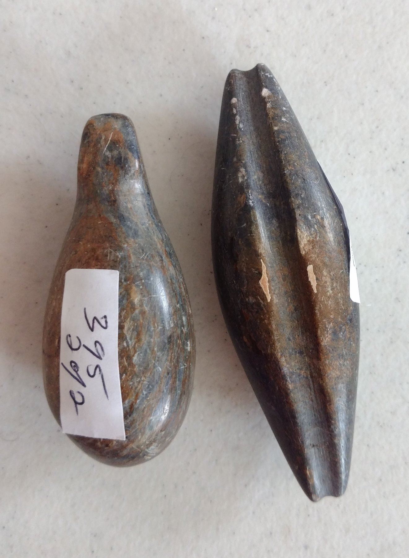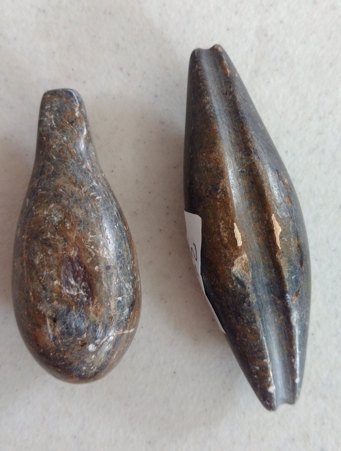 2 California Plummets, pre-historic items. Made of steatite, the items measure 4" and 3" each. Monterey County, California. 2 rare charm stones. Condition: Good, see images. Shipping: $17.50 w/insurance and signature.