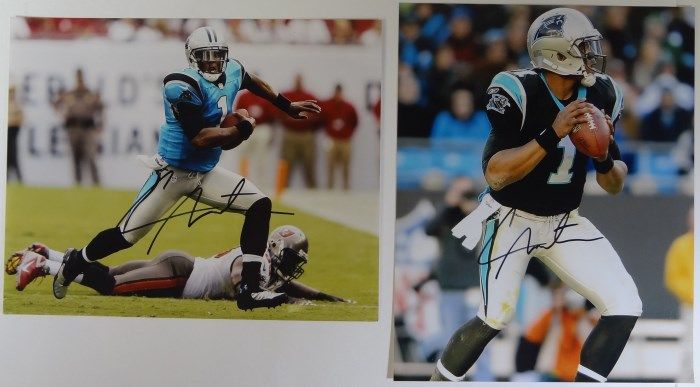 2 different action photo's Signed by Cam Newton in black sharpie. No COA's. Est. Value $150.00 - $200.00.