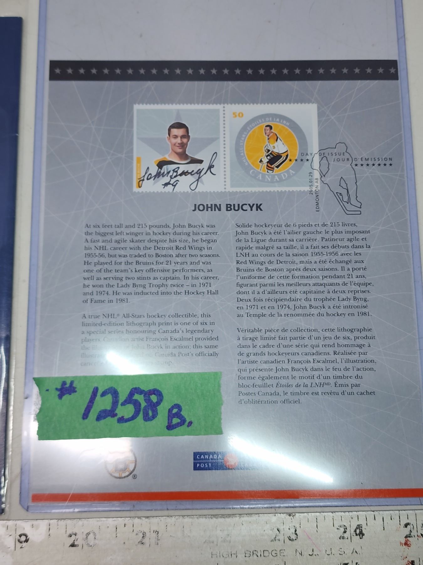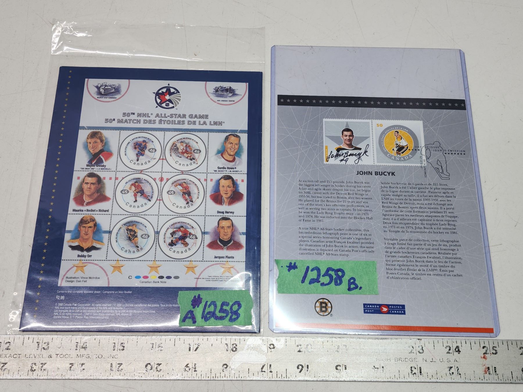 2 Canada Post stamp sets - John Bucyk 50 cent signed stamp & 50th NHL All star game stamp set