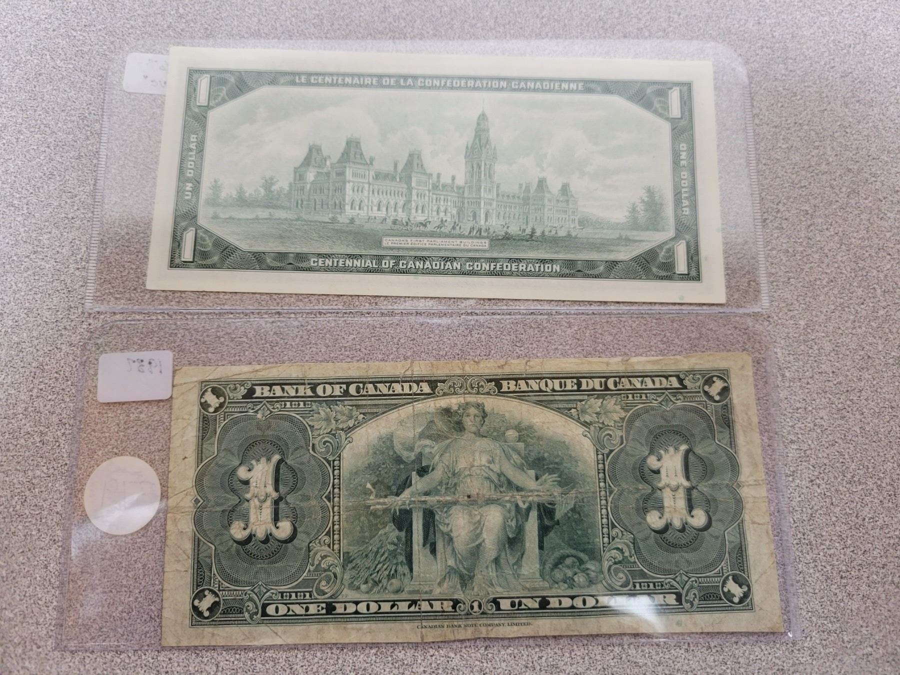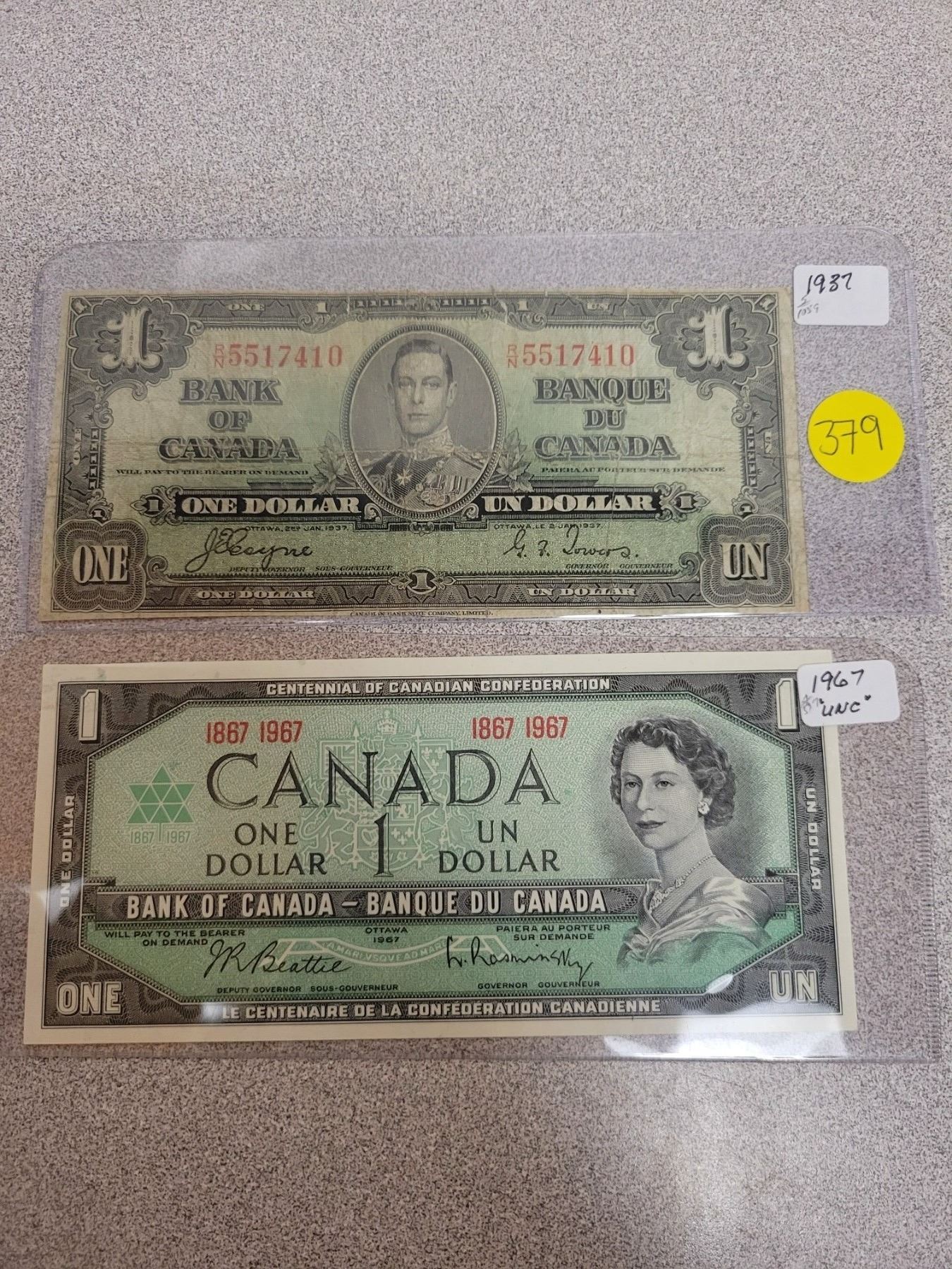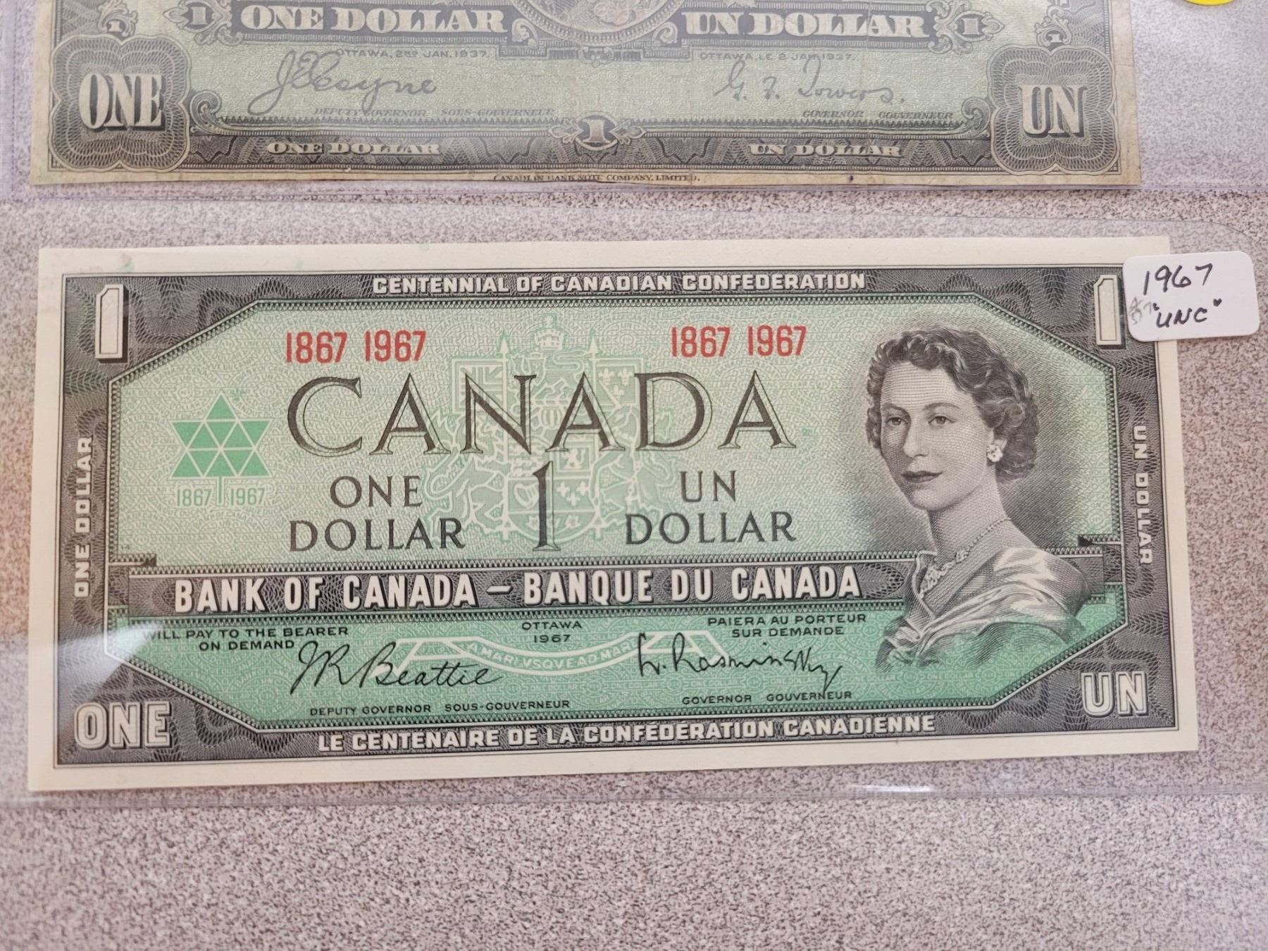 2 Canadian $1.00 one dollar bills - 1937 & unc 1967 centennial