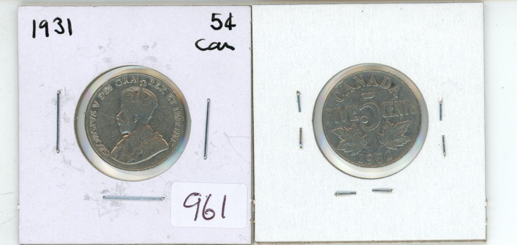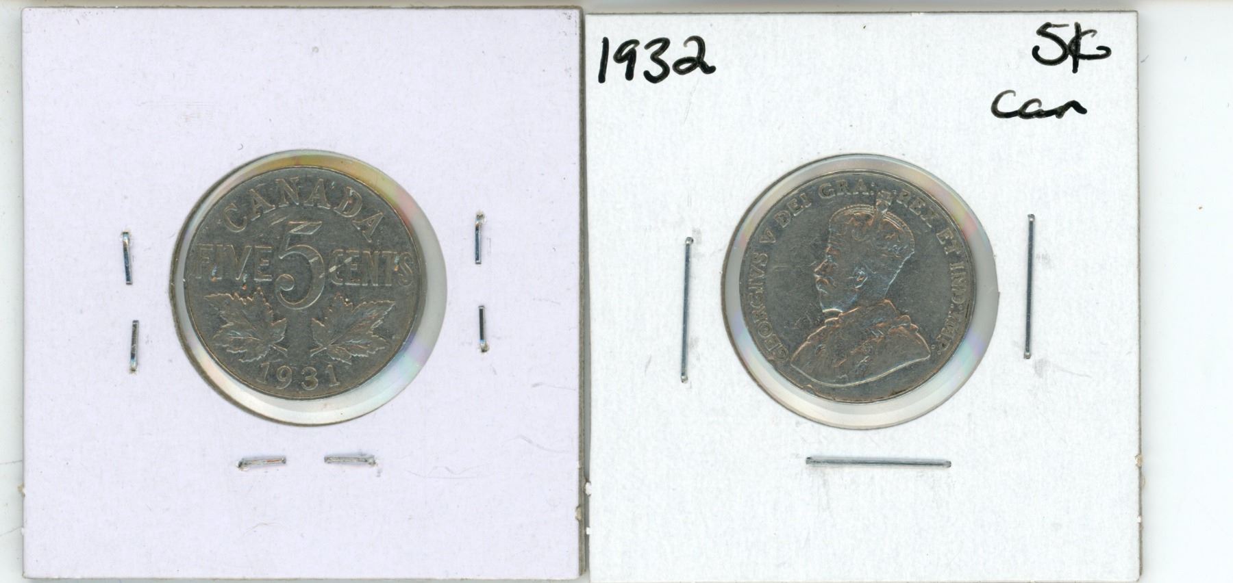 2 Canadian 5 cent coins - 1931-32
