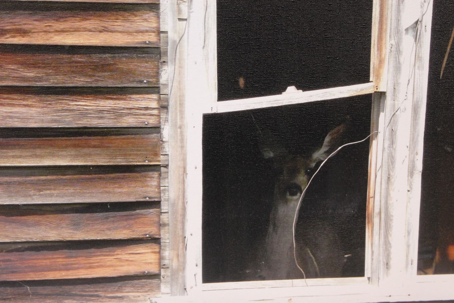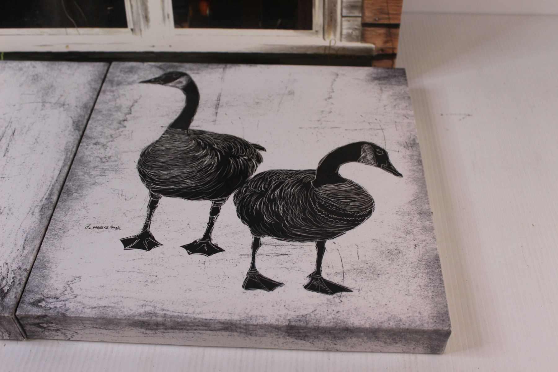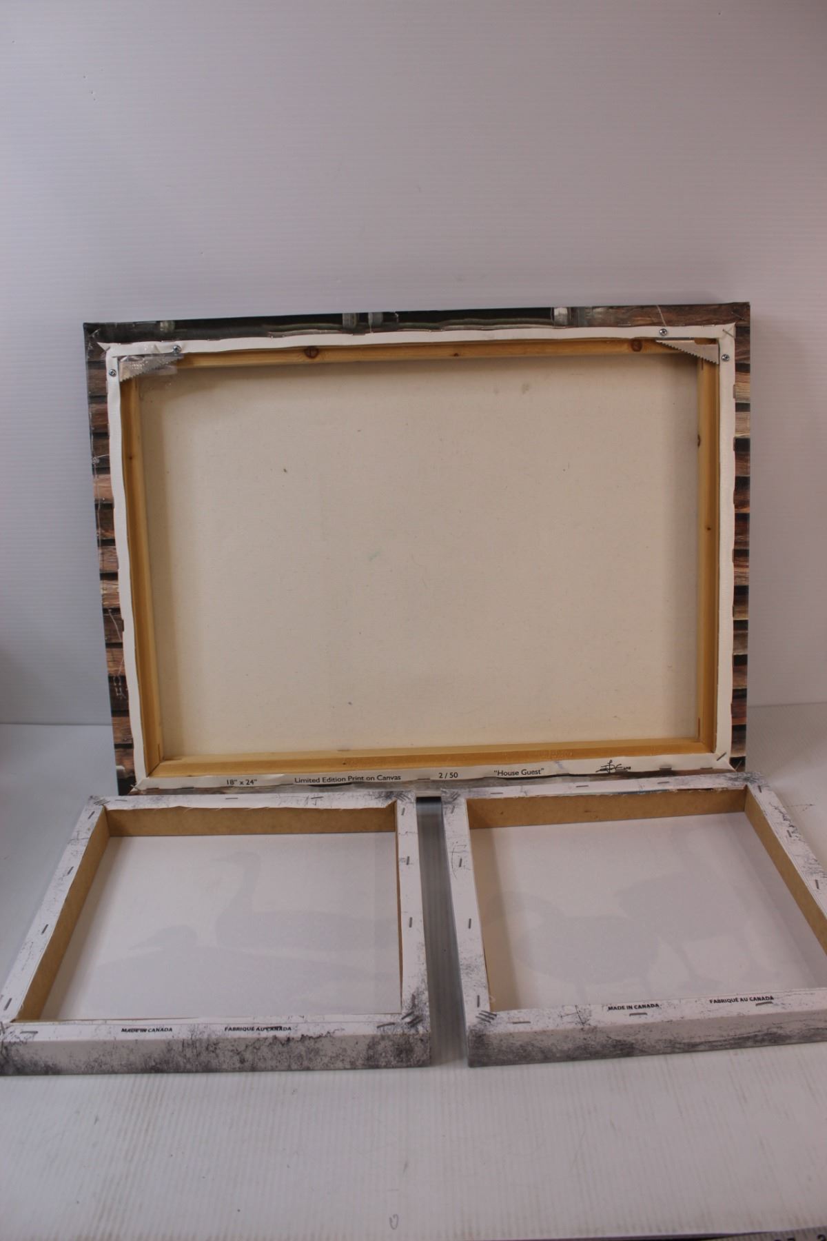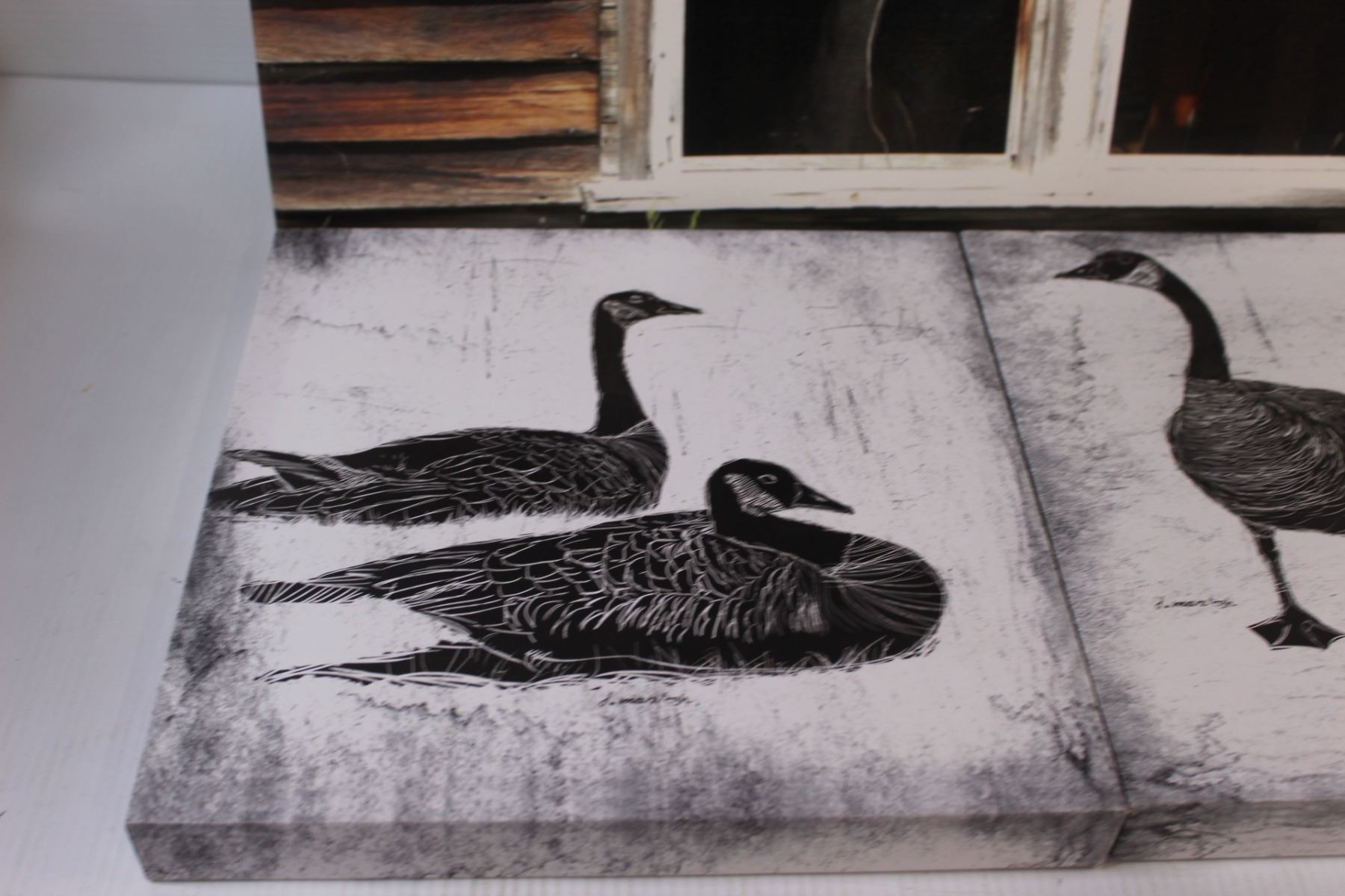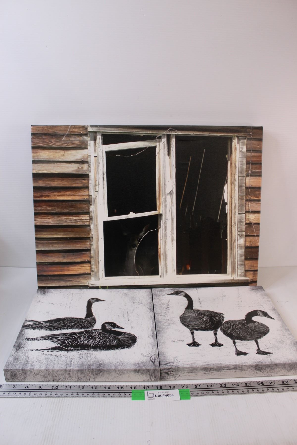 (2) Canadian Goose Print on Canvas (12"x12"), Deer in House Print on Canvas (24"x18")