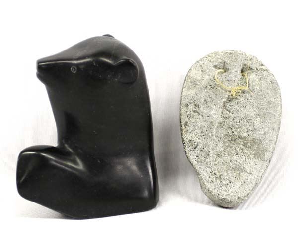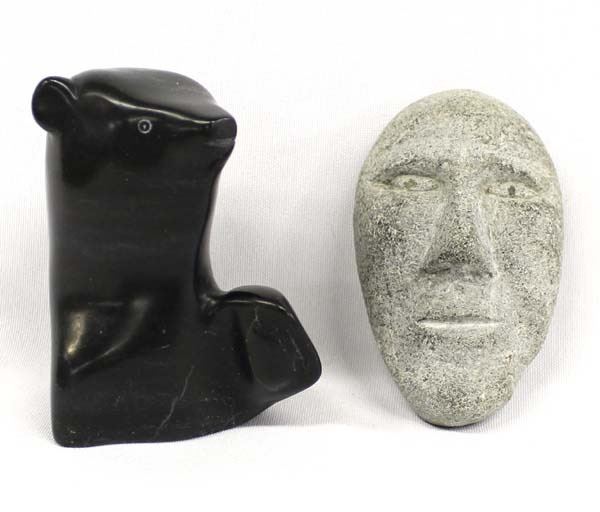 2 Native American Canadian Inuit Carved Stone Bear & Maskette, maskette measures 4'' x 2'' and bear measures 2.5'' x 3'' x 3.5'', Bust of Bear is by Jaw Kingwatsiak (b. 1962)