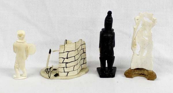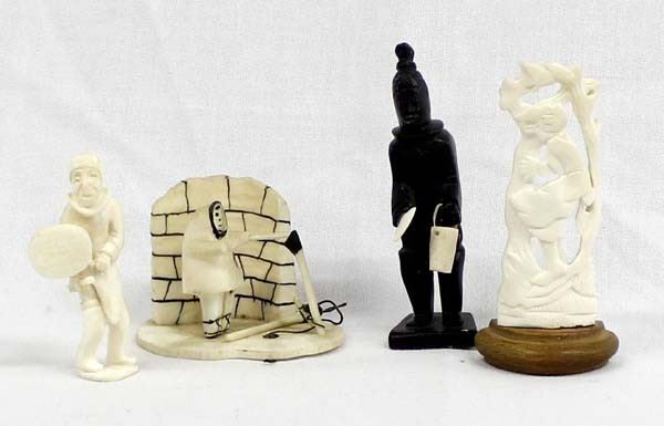 2 Canadian Inuit Carvings & 2 Carved Bone Figures, includes: 1. Paamiut Carving of Mussel Collector by P.M. Petersen, measures 1.25''W x 4''H and is signed on the bottom 2. Canadian Inuit Carved Bone Ice Fisherman, unsigned and measures 3'' x 2'' x 2'' 3. 1998 Carved Bone Drummer Figure, artist's initials on the bottom, measures 3''H x 1.5''W 4. Albanian Carved Bone Young Woman Walking in the Wind, measures 4'' x 2''