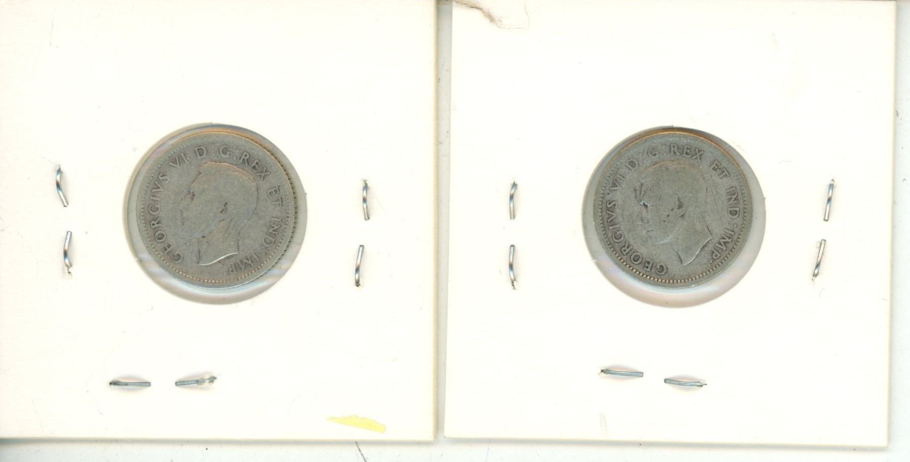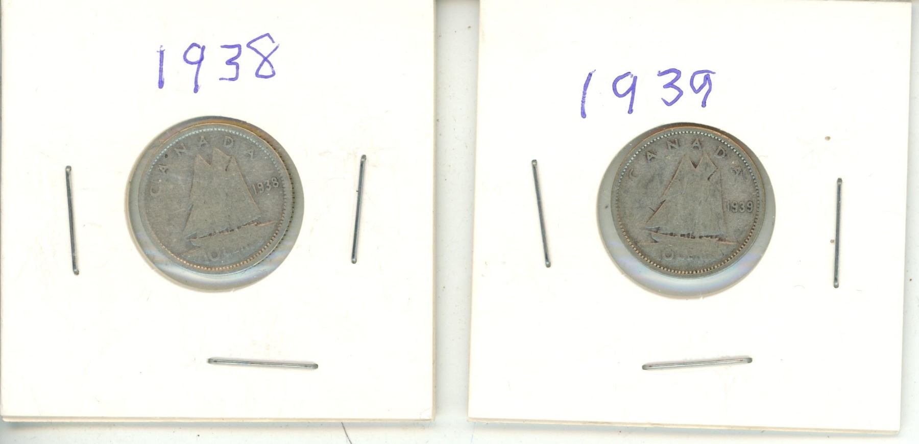 (2) Canadian Ten Cent Coins, Consecutive 1938 and 1939. 80% Silver