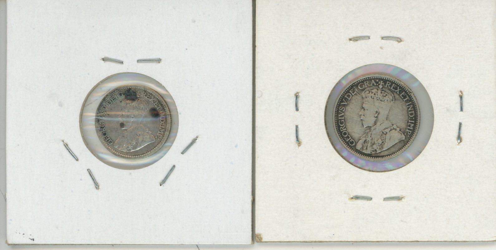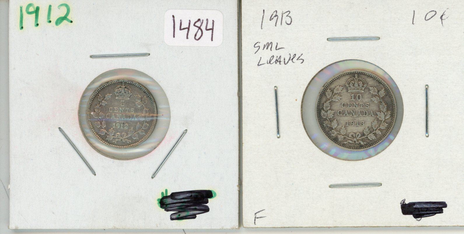 2 Canadian silver 5 cent coins - 1912 & 1913