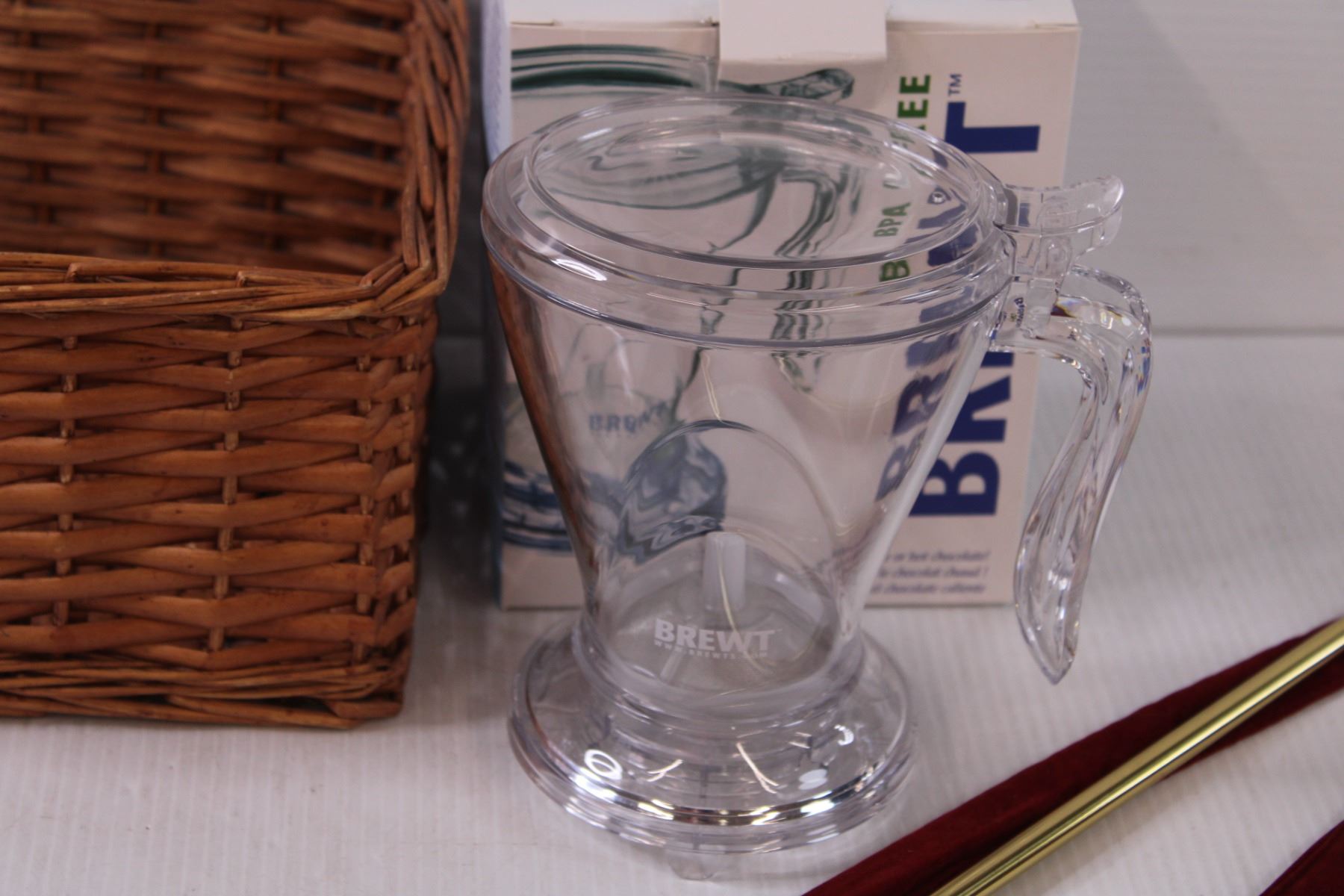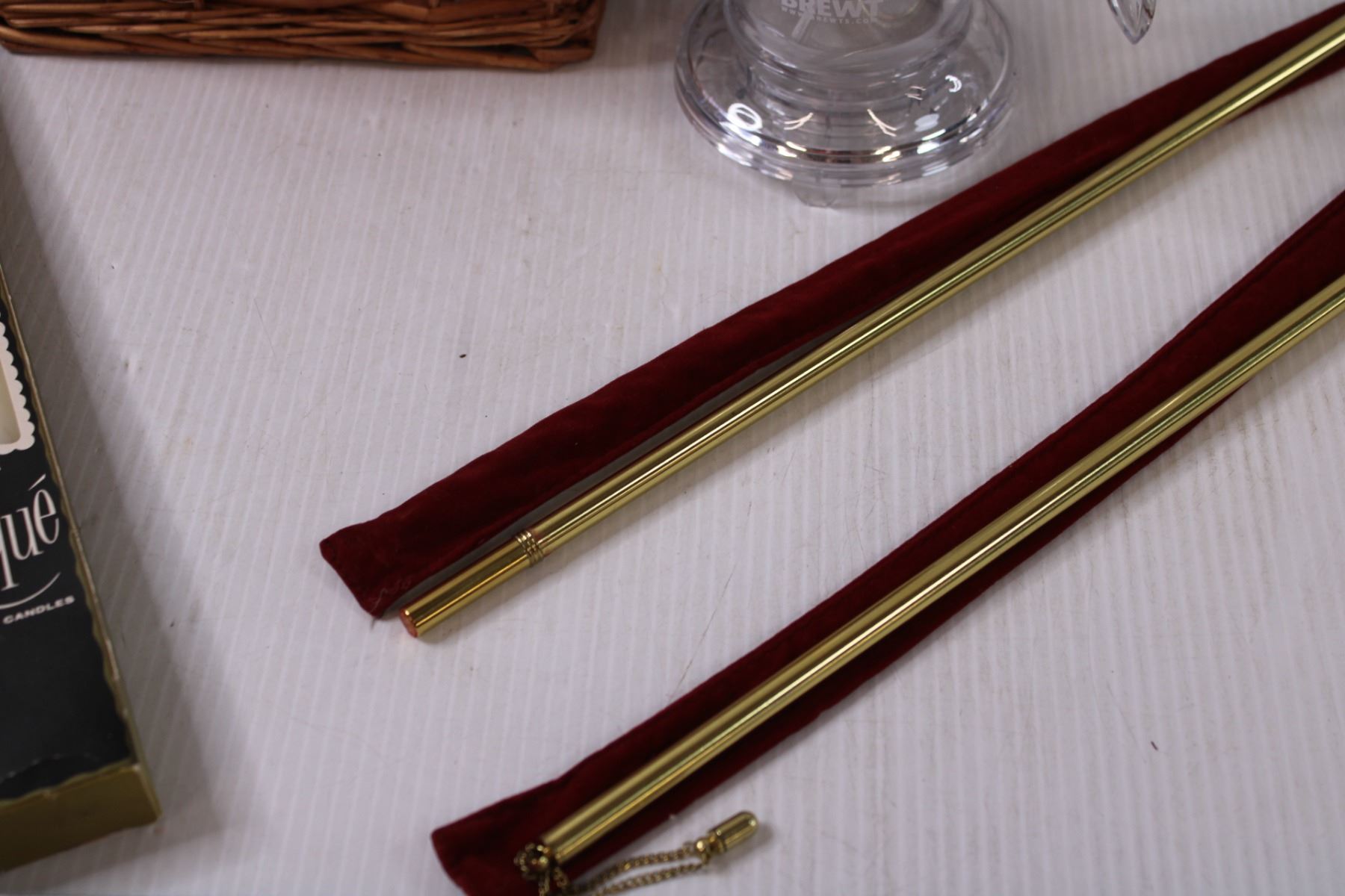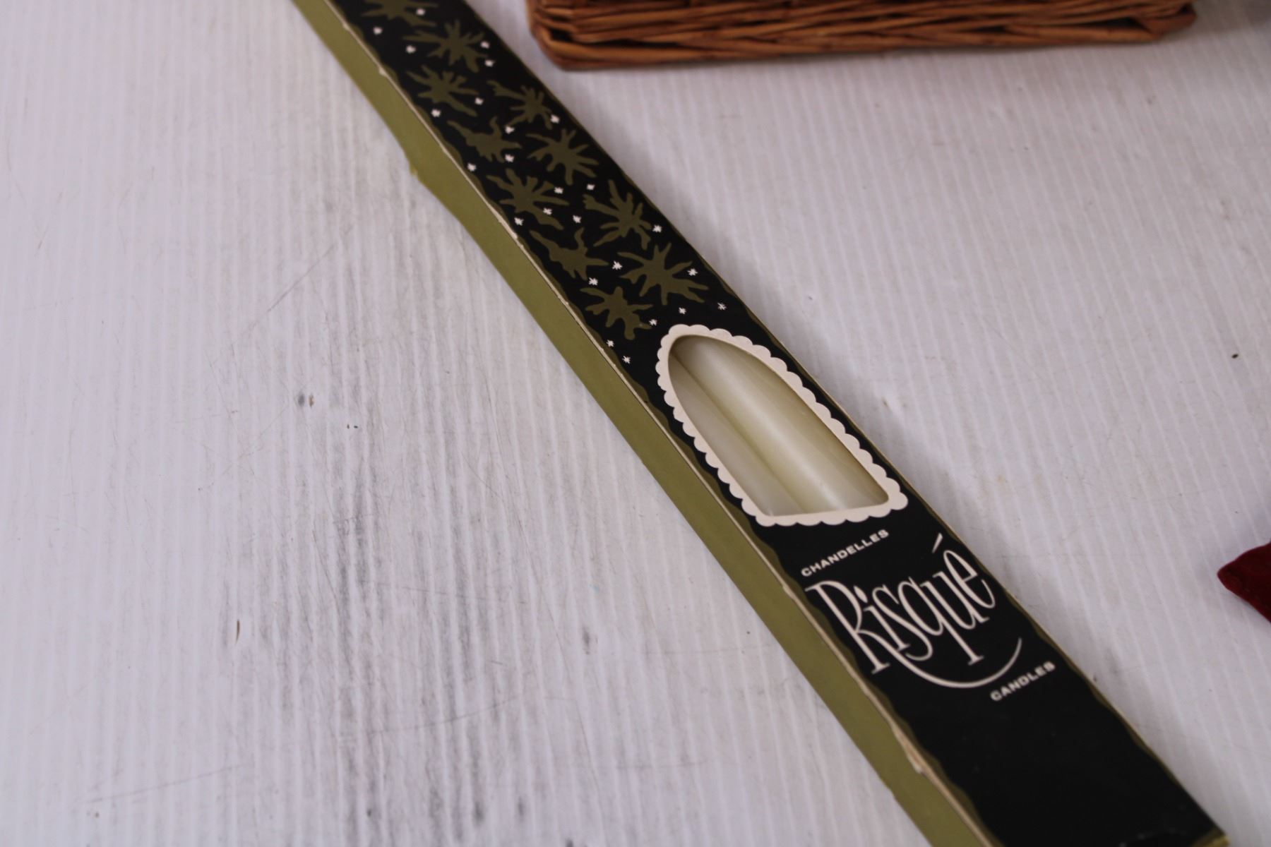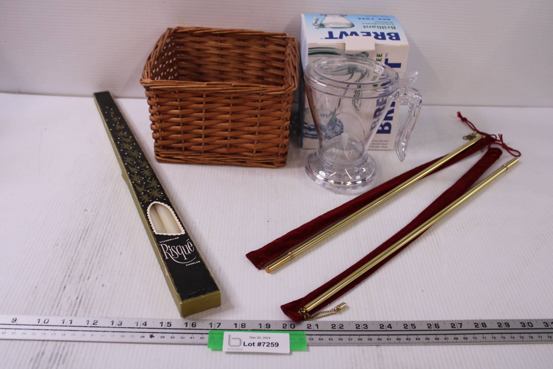 (2) Candles, (2) Fireplace Spark Lighters w/Cases, Brewt & Wicker Basket