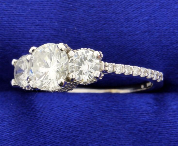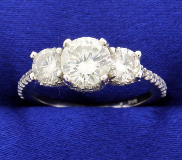 The ultimate diamond ring! This 1.80 carat diamond ring has three sparkling diamonds set in 14k white gold. The center brilliant cut diamond is 1.14 carats, clarity SI and color G. The 0.7 carat TW of two side diamonds and .16 cts of smalls diamonds in shank are SI clarity and G color. Size 6 1/2 3.5g
