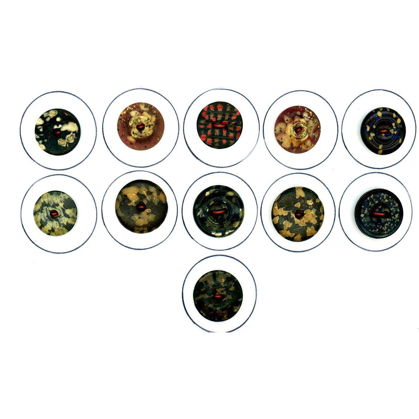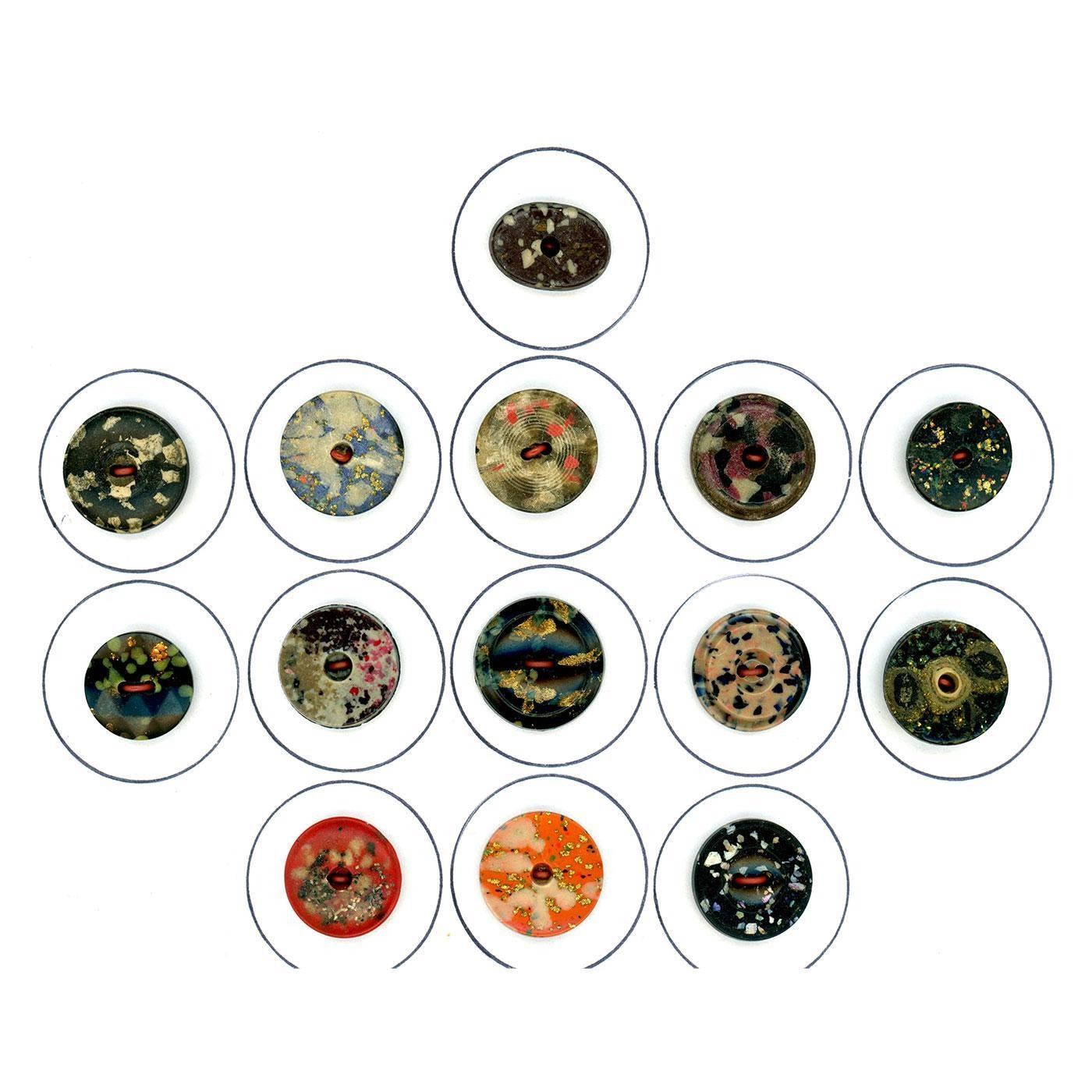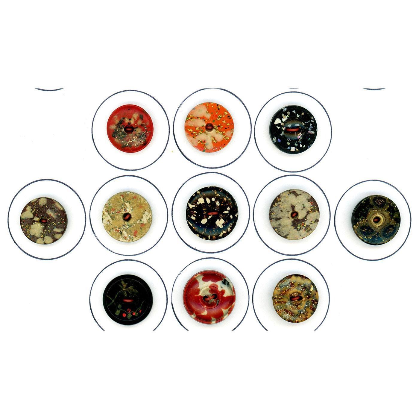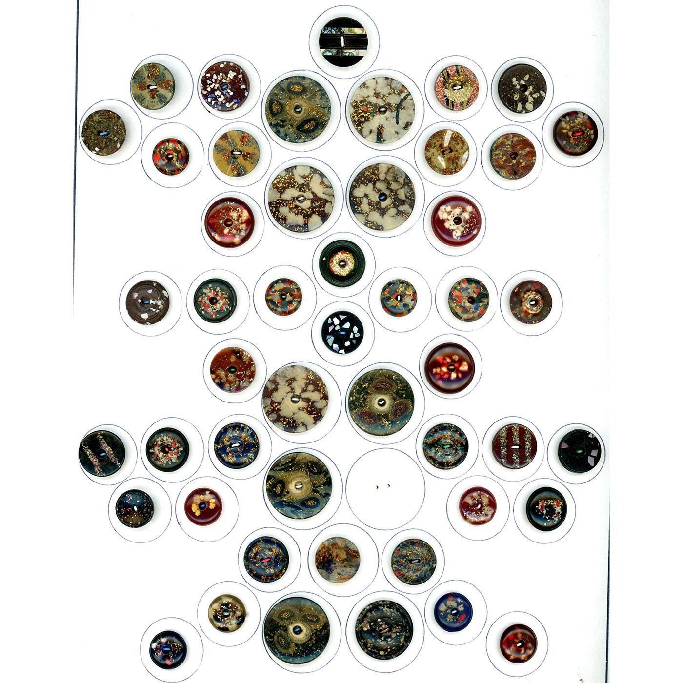 82 Small/Medium 19th century horn and compo buttons. These two cards includes a plethora of gold fleck and pearl inlays in a variety of colored dyed bases along with some pearl inlay examples as well.