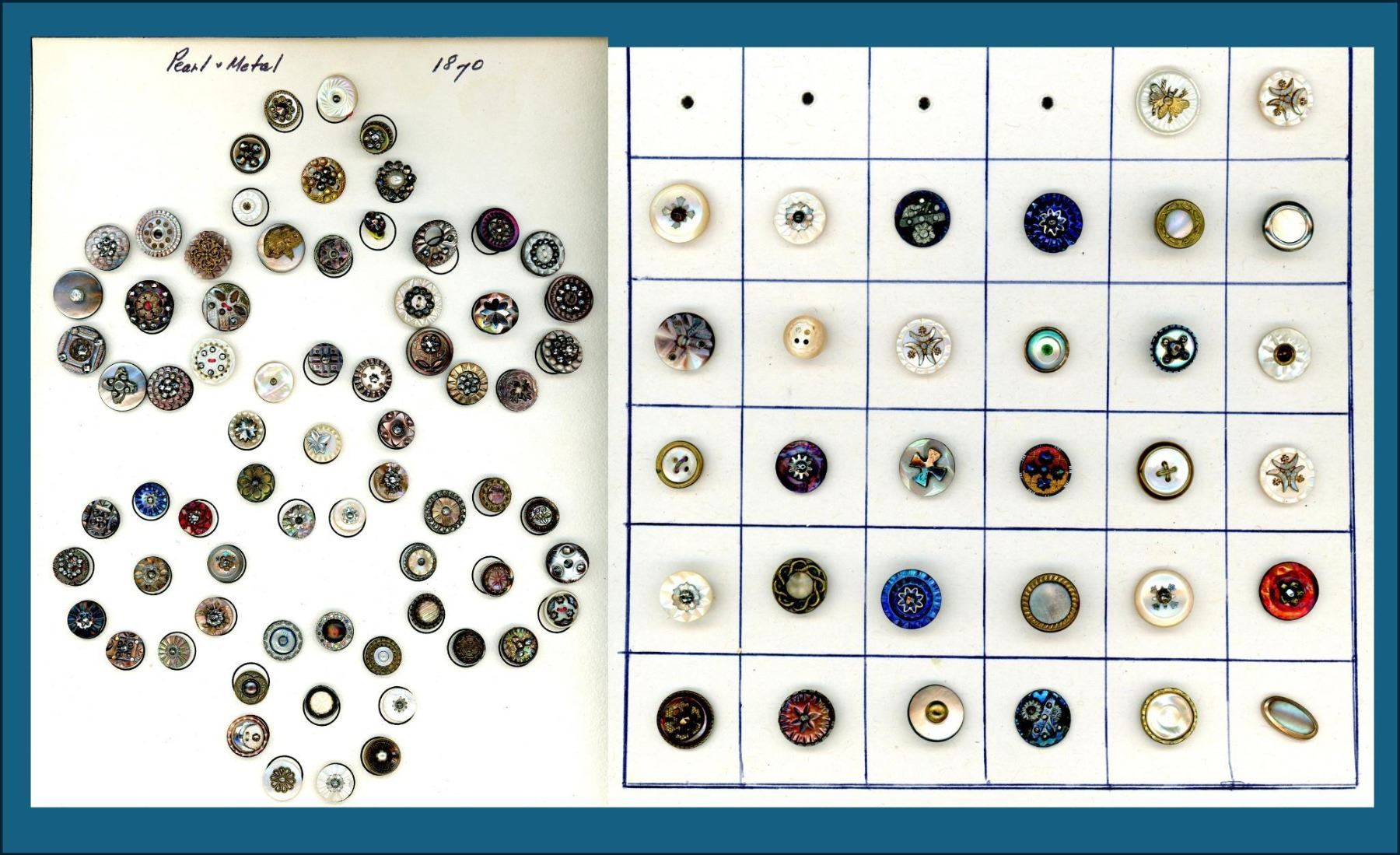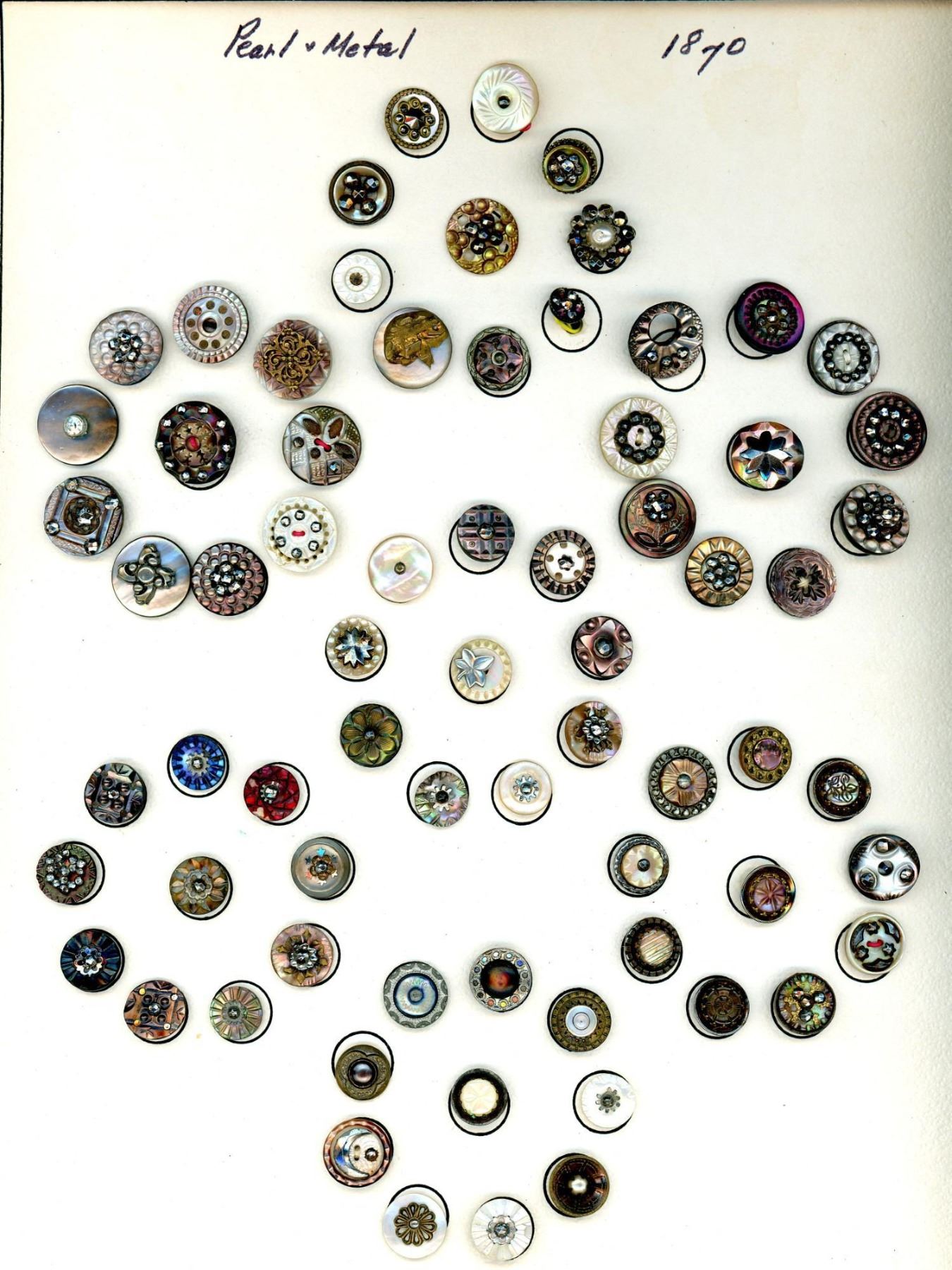 102 Small 19th century metal OME examples. From the collection of the late Dorothy Peterson of Virginia and a member of the Martha Washington Button Club. This is a very nice selection of these desirable buttons among collectors and creators. The lot includes cut steel OME, brass OME, watch wheels, pewter, pictorials and more.