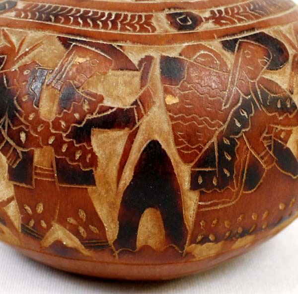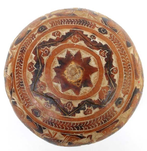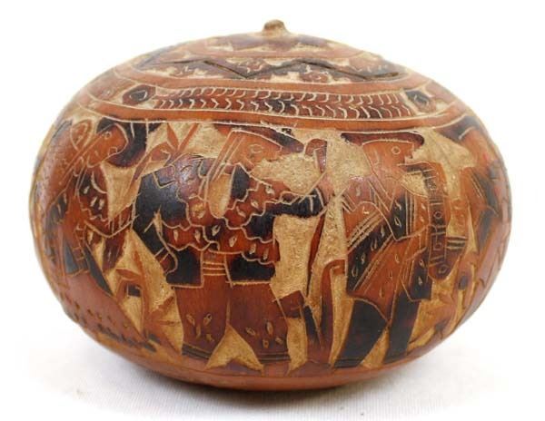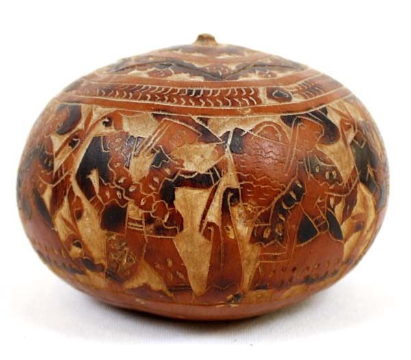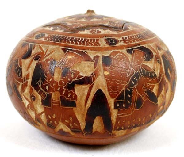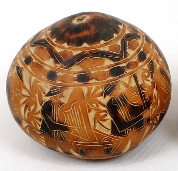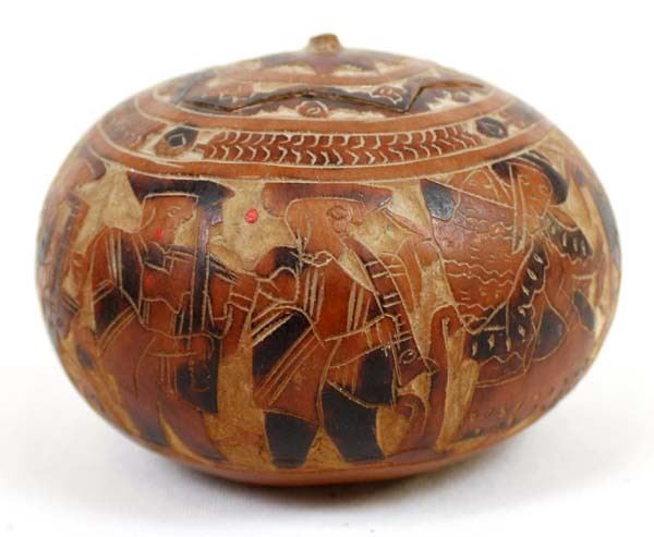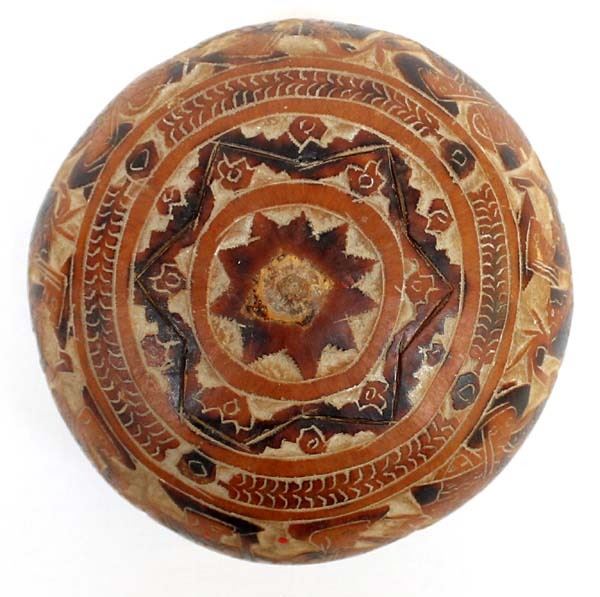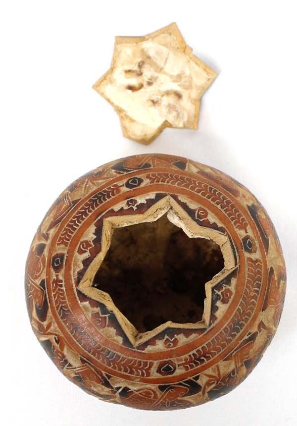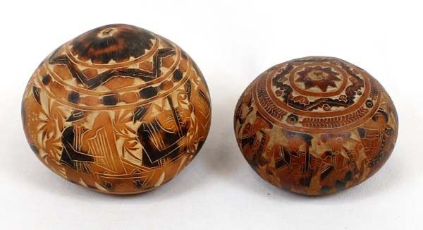 2 Carved and Hand Painted Gourds. Largest is 4'' x 5'' and has removable lid.