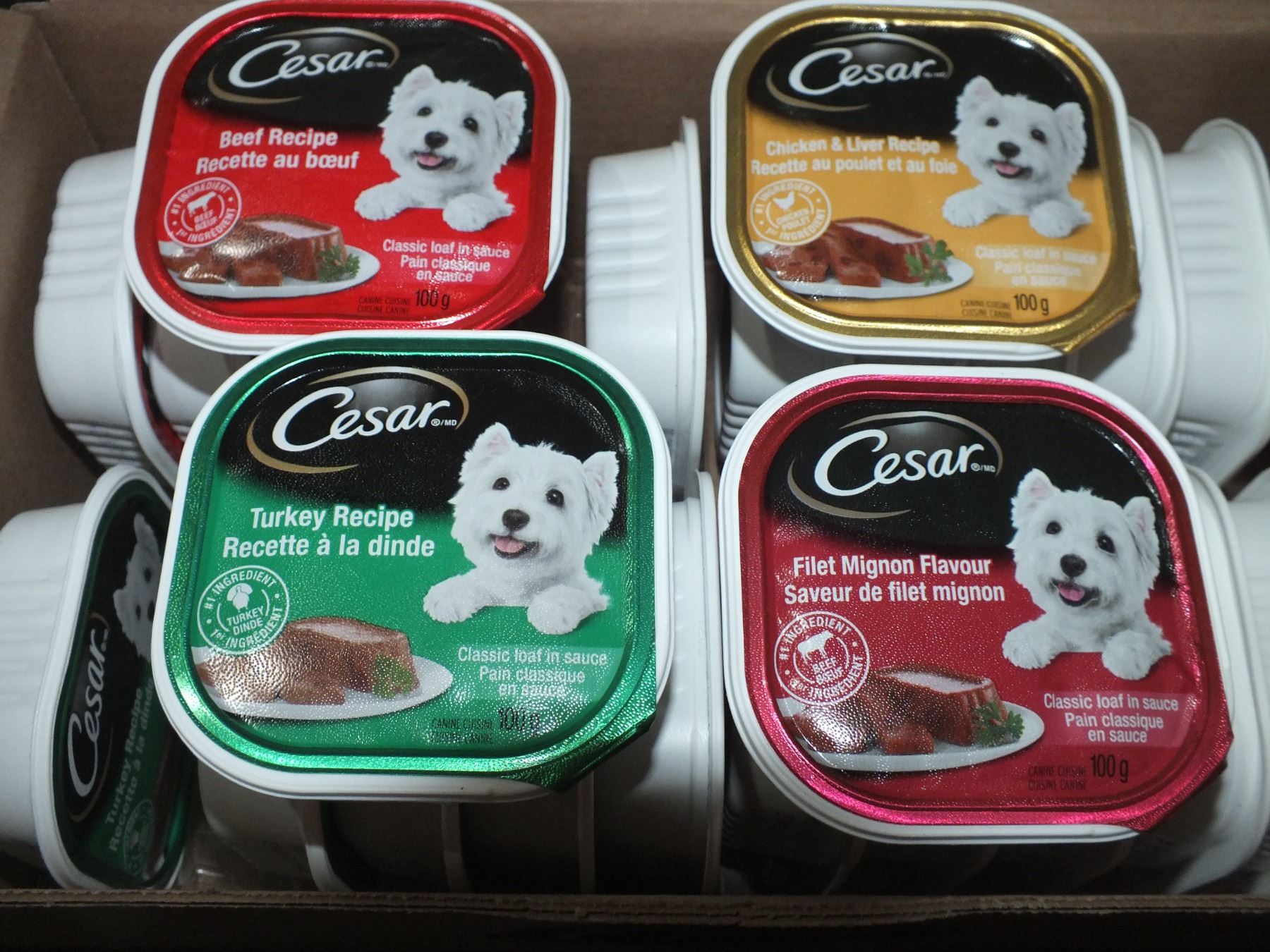 2 Case's Of Cesar Dog Food, you get 6 filet mignon, 6 turkey, 6 beef and 6 chicken and liver flavors per case, 48 tins altogether...New