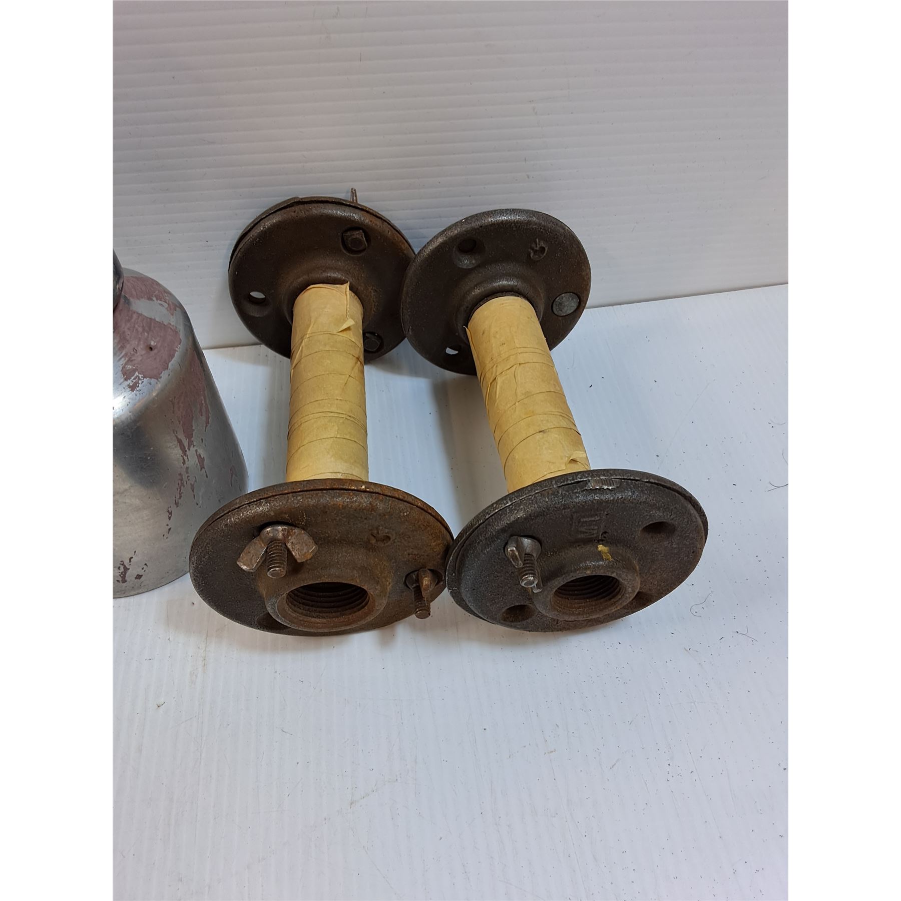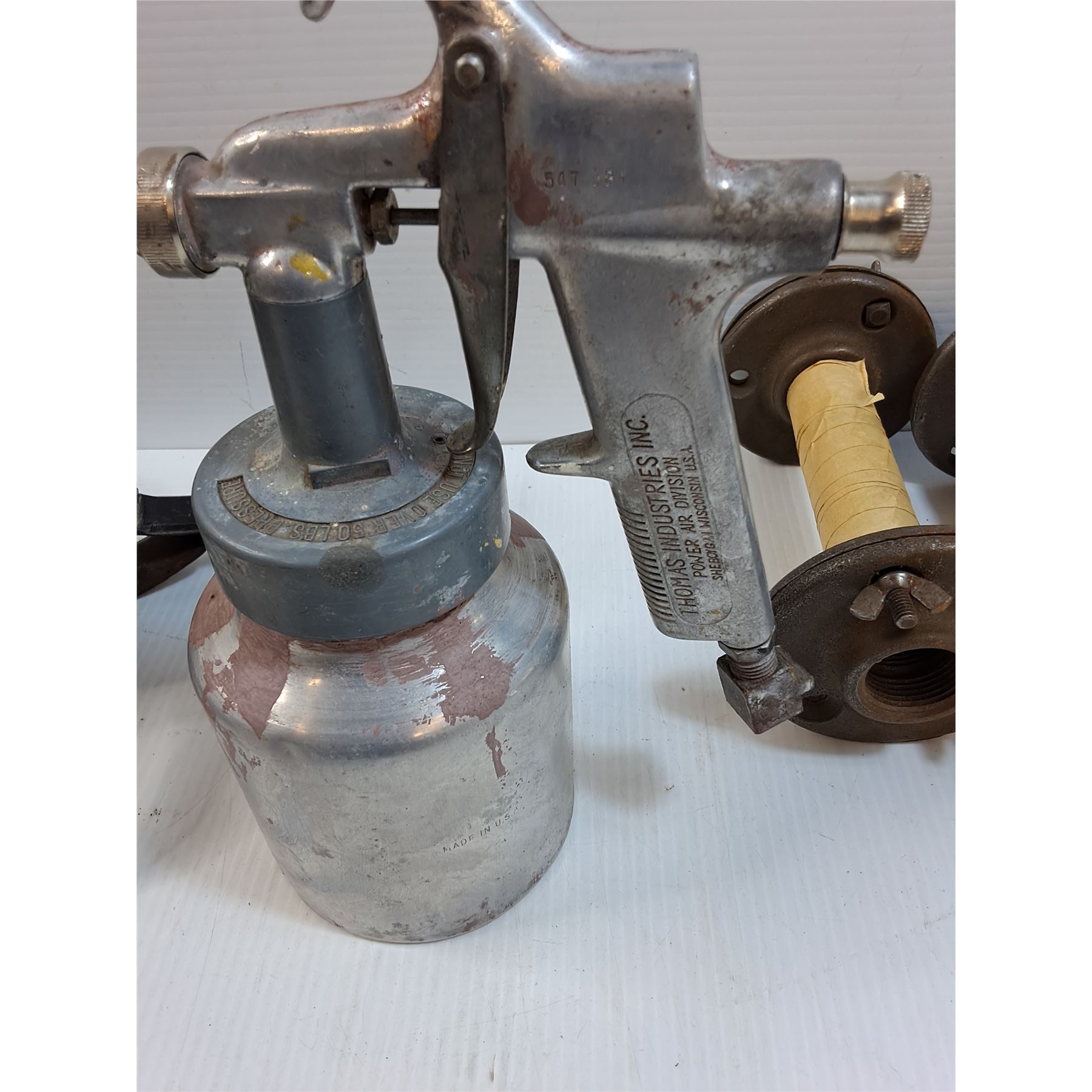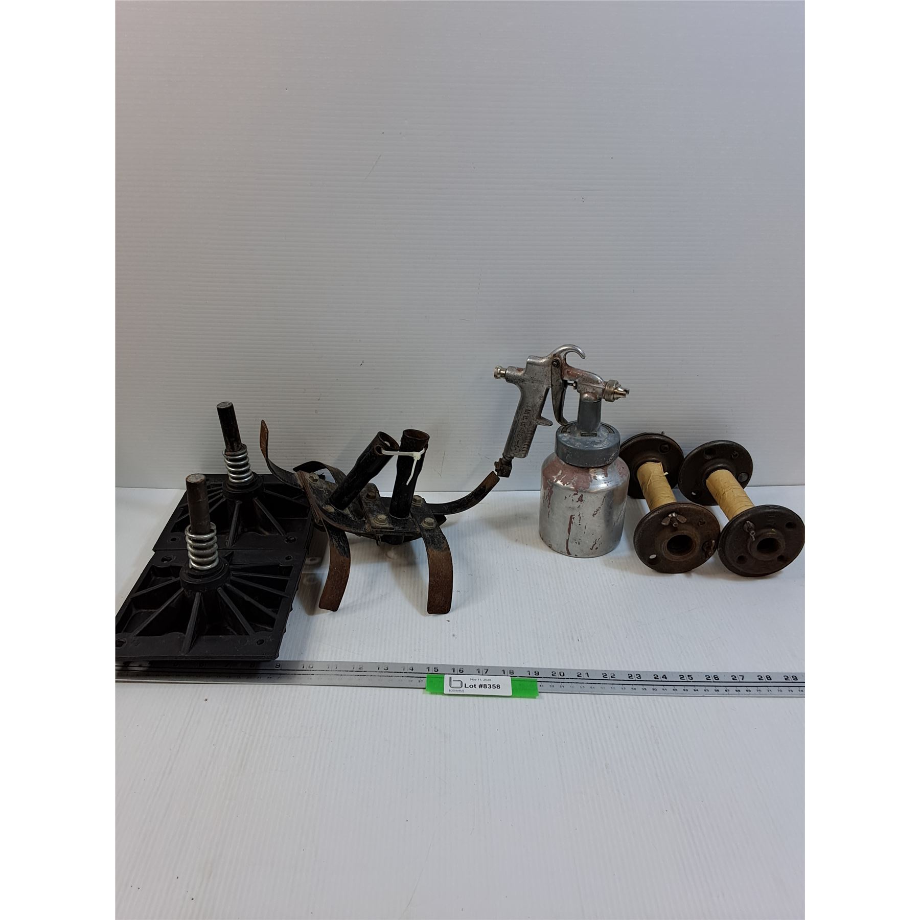 (2) Cast Iron Base Feet, Rototiller Tines, Thomas Gravity Feed Paint Gun, (2) Base Feet