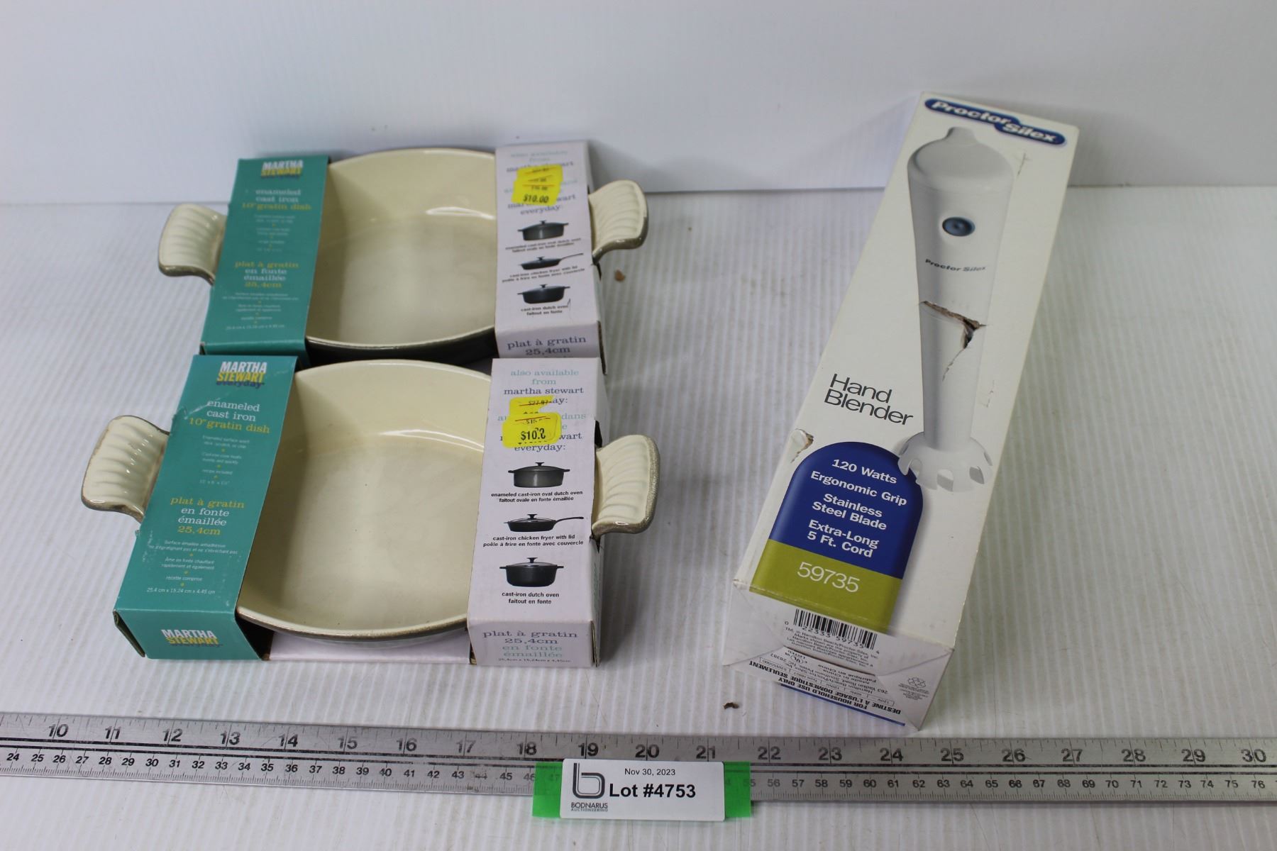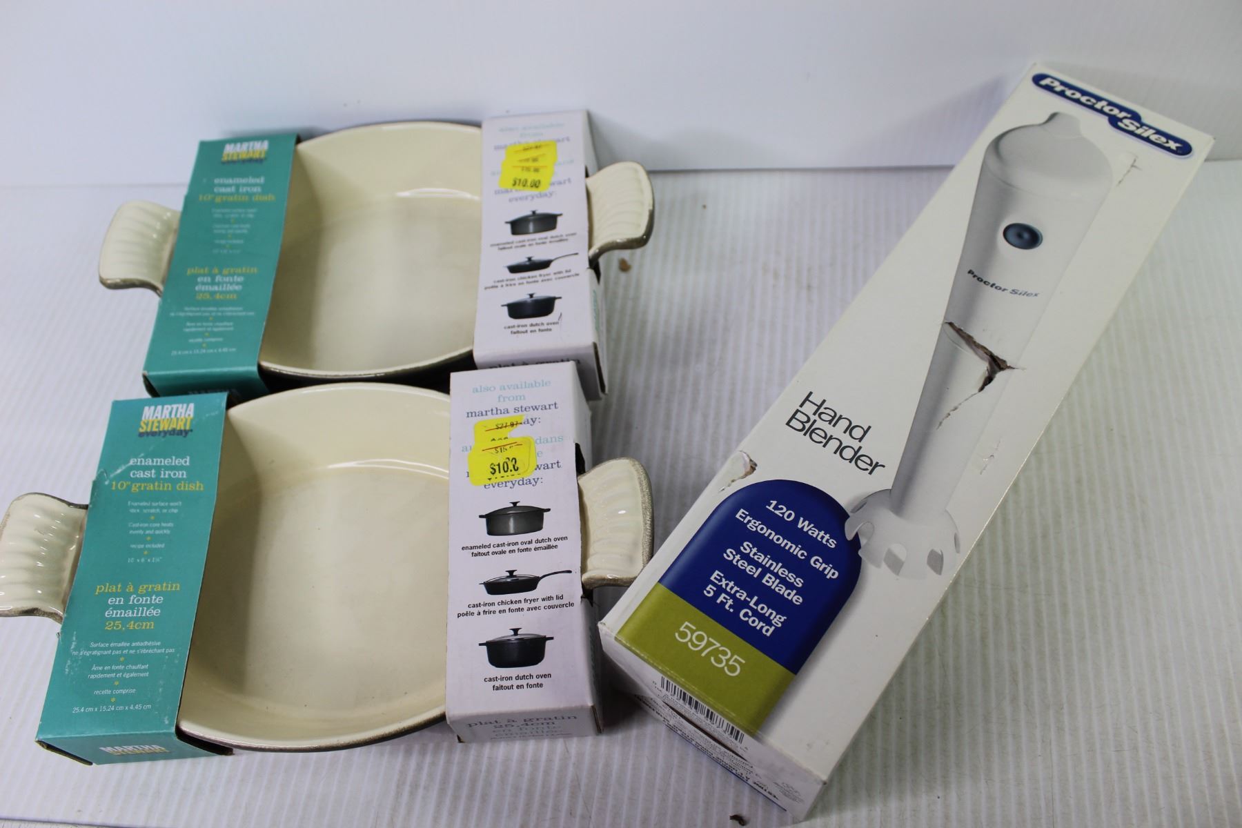 (2) Cast Iron Enameled 10" Dish - Proctor Silex Hand Blender (NIB)