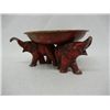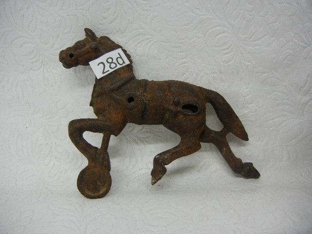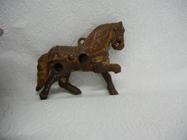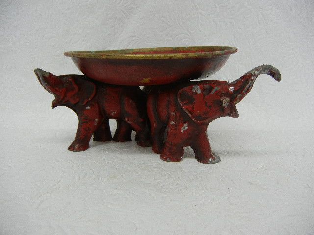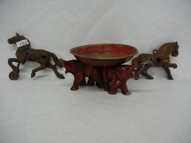 2 Cast Iron Horses, 1 Broken Leg on both, and Red Cast Iron Elephant Bowl, broken trunk