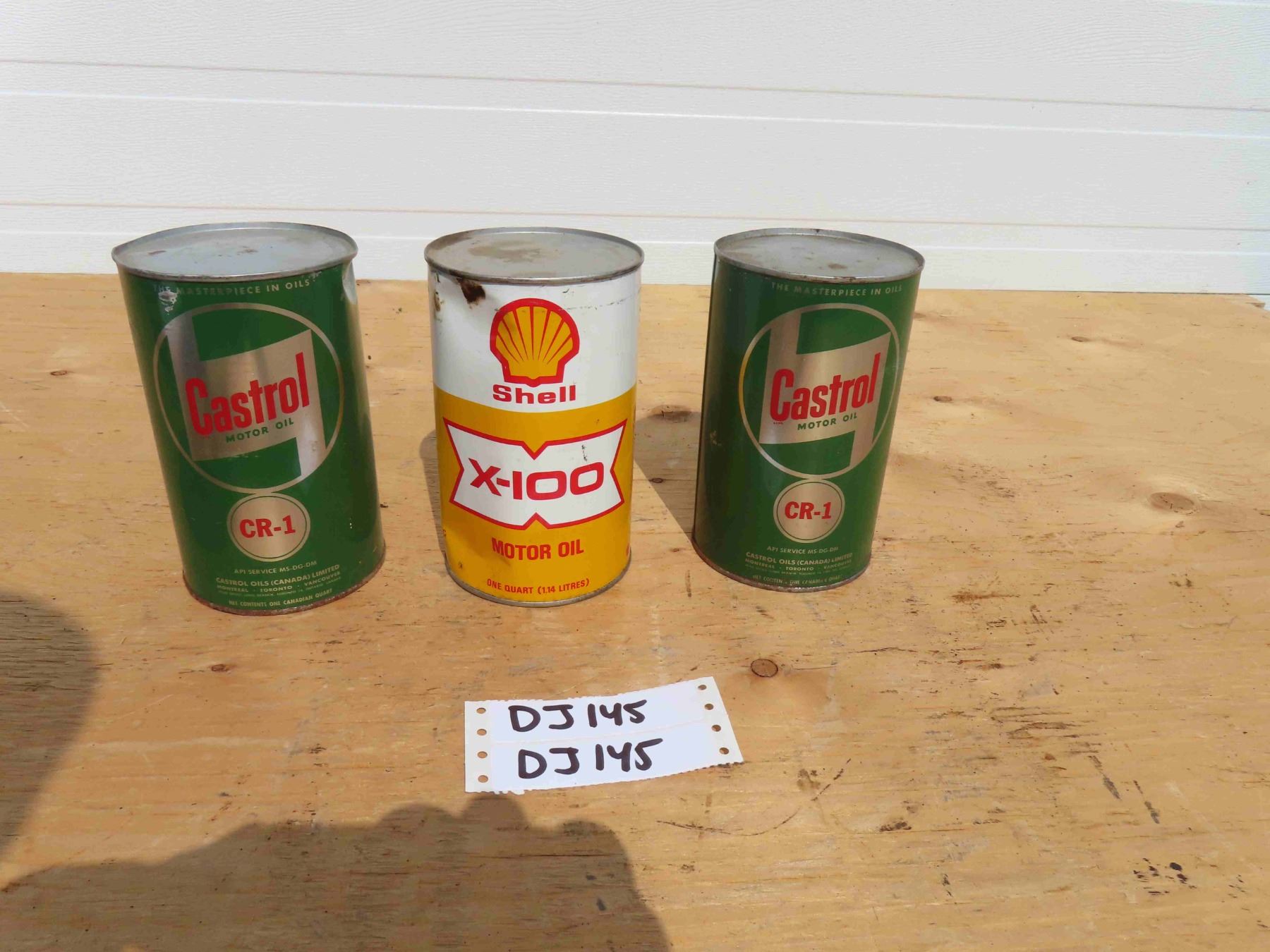 2 Castrol CR - 1 Motor Oil 1 Quart Tins , Shell X-100 Motor Oil 1 Quart Tin - All Full of Contents