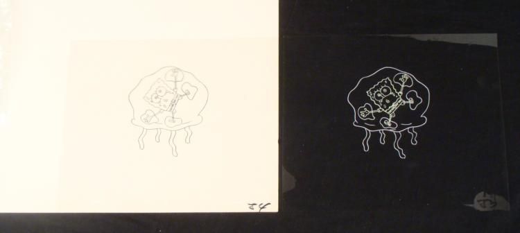 This original animation cels are from the Nickelodeon TV show SpongeBob Squarepants. The story takes place under the deep blue seain Bikini Bottom, where SpongeBob resides. SpongeBob, who is a yellow,porous sponge, is your typical happy-go-lucky character, as he is always cheerful and enjoys making people laugh. Patrick Star, SpongeBob's neighbor who is a starfish, is your average children's show idiot, as he boasts knowing nothing and is often getting himself into ridiculous situations. Between the homes of these two lies the home of the miserable Squidward, a squid, who is known for being grouchy and playing tricks on SpongeBob and Patrick. Both SpongeBoband Squidward work at the Krusty Krab, a fast food business run by the greedy money-loving Mr. Krabs, a crab, the arch rival of the evil, possibly misunderstood, Plankton. Another neighbor, Sandy Cheeks, an athletic squirrel who normally wears an astronaut's space suit, was introduced in "Tea at the Treedome." She spends most of her time inventing and experimenting. * Here are two very similar cels. * * Help, I have tripped and fallen into a jellyfish and I can't get out... * * Original Production Animated CelsOverall Size of Cel: 10 1/2" x 12 1/2" * Excellent ConditionThis is an original hand-painted cel set-up used in the production of an episode of "SpongeBob SquarePants." Each one-of-a-kind set-up represents a slight change in position of the characters. When individually photographed and projected in rapid succession, the images appear to move. * To create production cels, the original animator's drawing is transferred onto an acetate cel (by hand-inking and/or photo copying). The cel is then hand-painted on the reverse side. * The cels are ready to be matted and framed. The animator's notations are at the bottom of the cels. * *