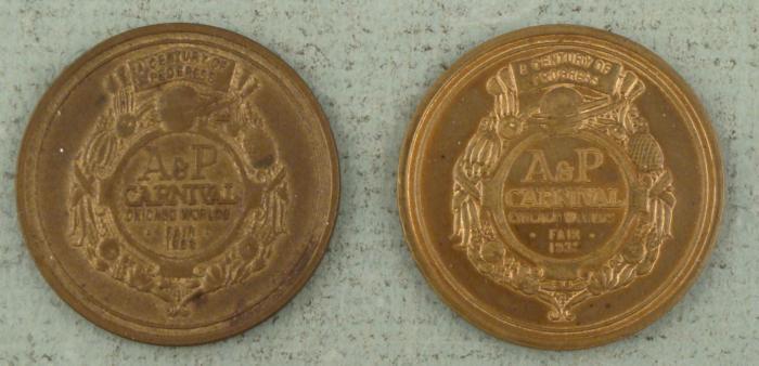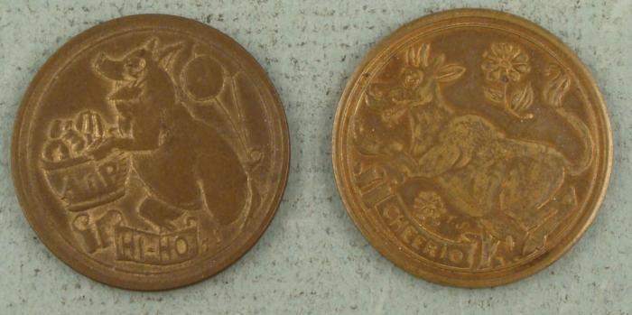 Hi Ho Pig carrying a basketCheerio Cow with daisyReverse on both: A & P CARNIVAL, Chicago World's Fair 1933Diameter: 1 3/8"