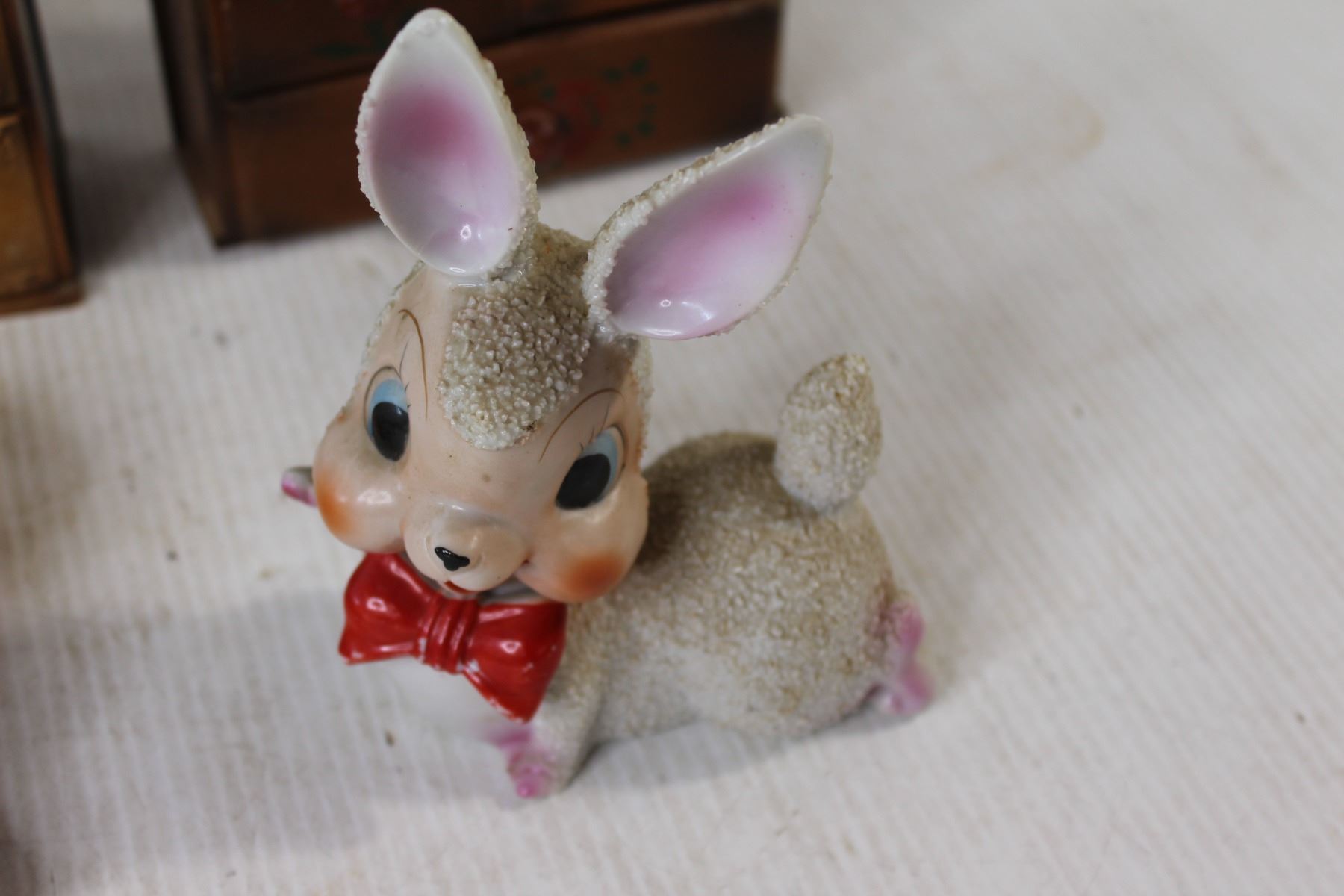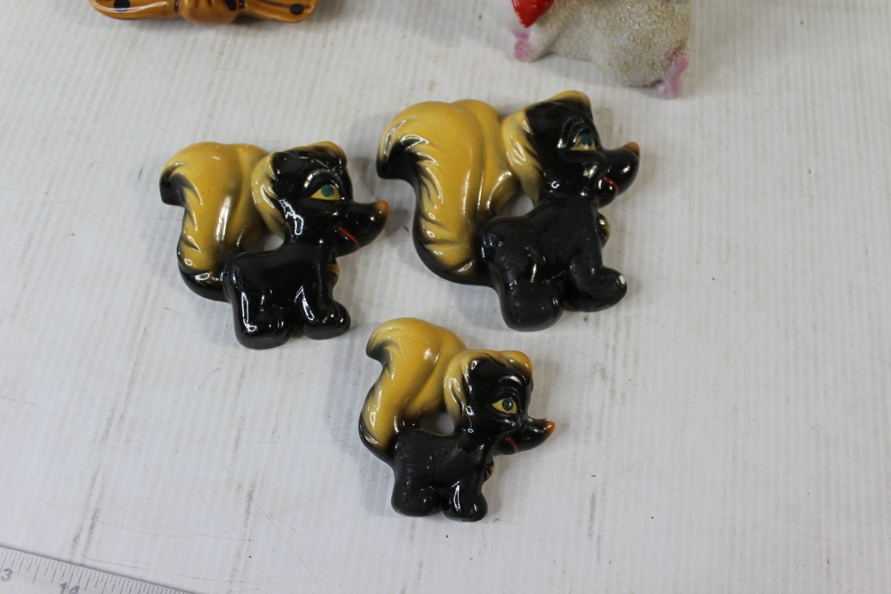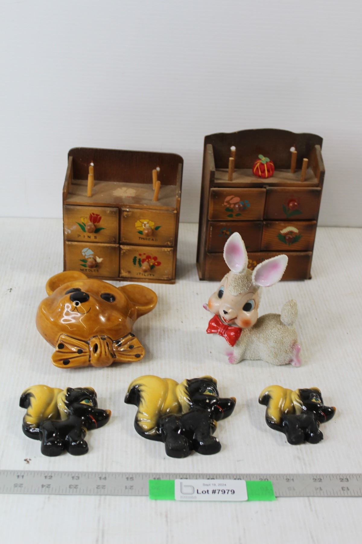 (2) Ceramic Animal Decorations, Set of Skunk Chalkware Wall Hangers, (2) Sewing Small Shelf Storage