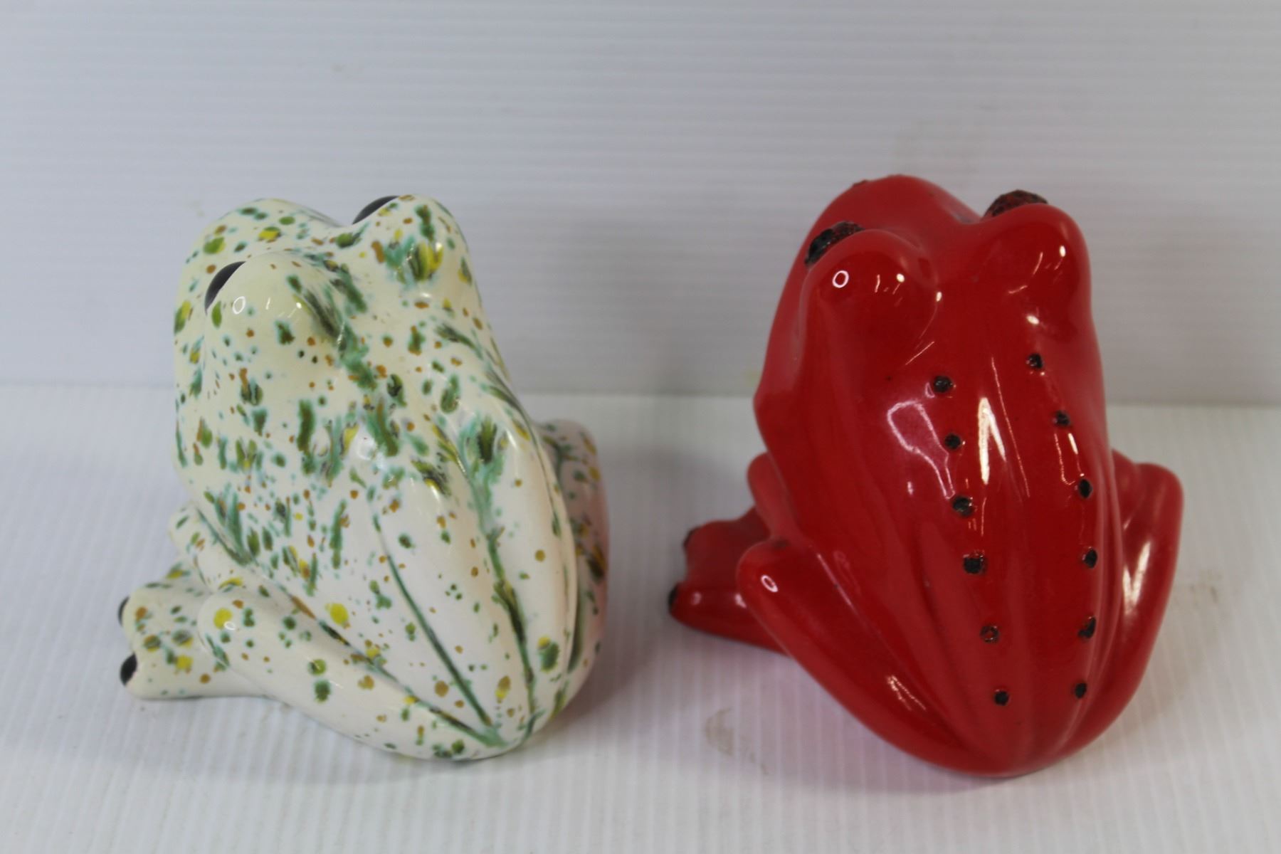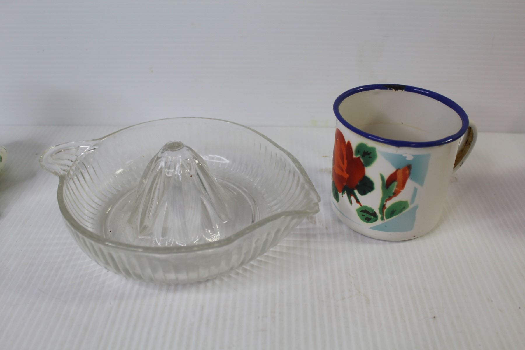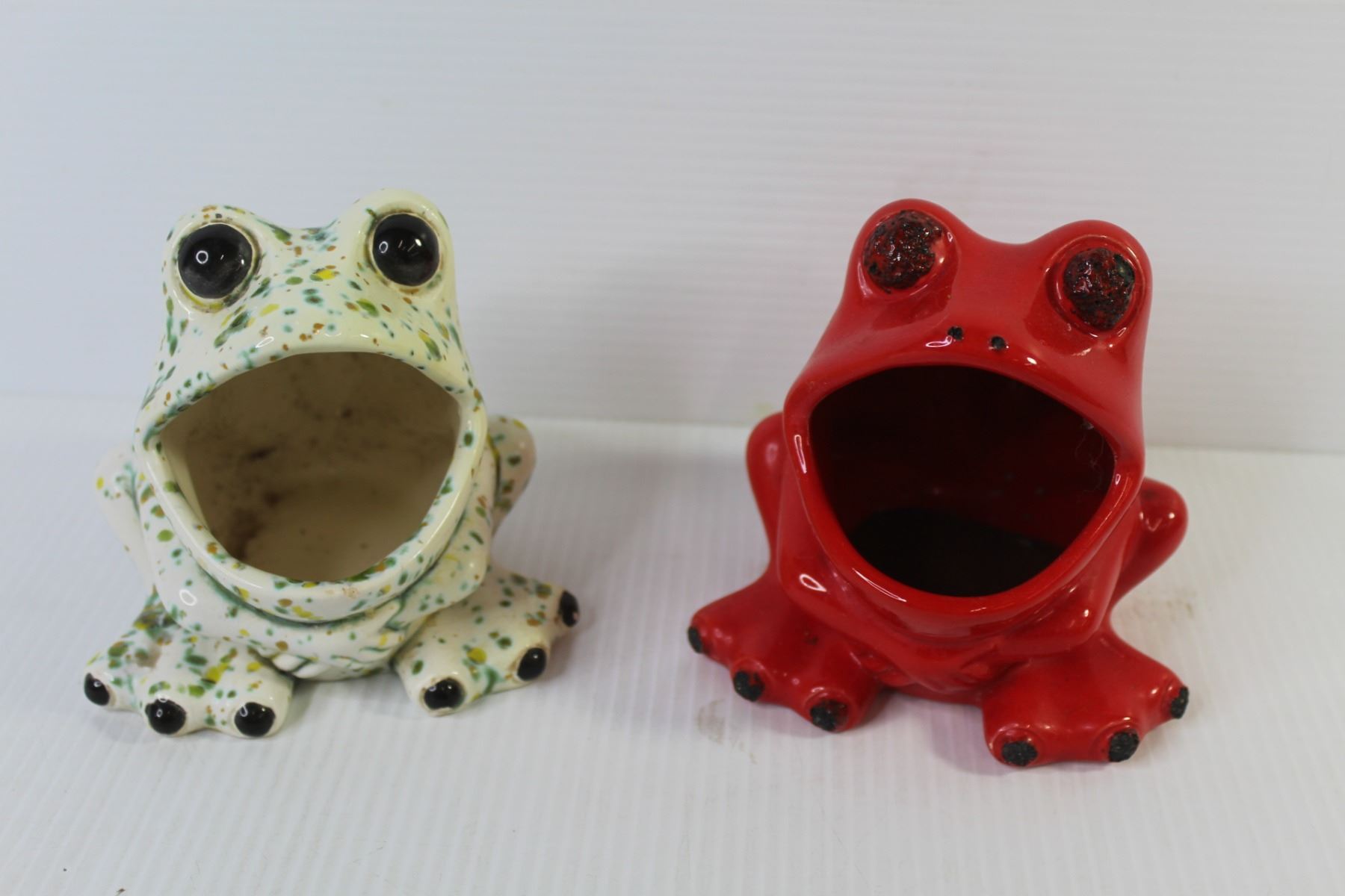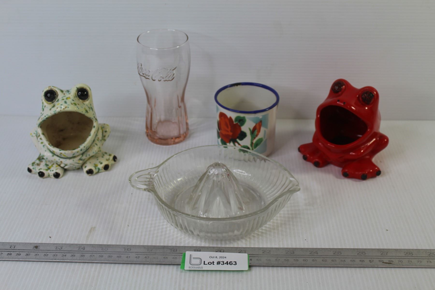 (2) Ceramic Frog Scrubby Holders - Juicer (has chip) - Tin Cup - Pink Coca-Cola Glass