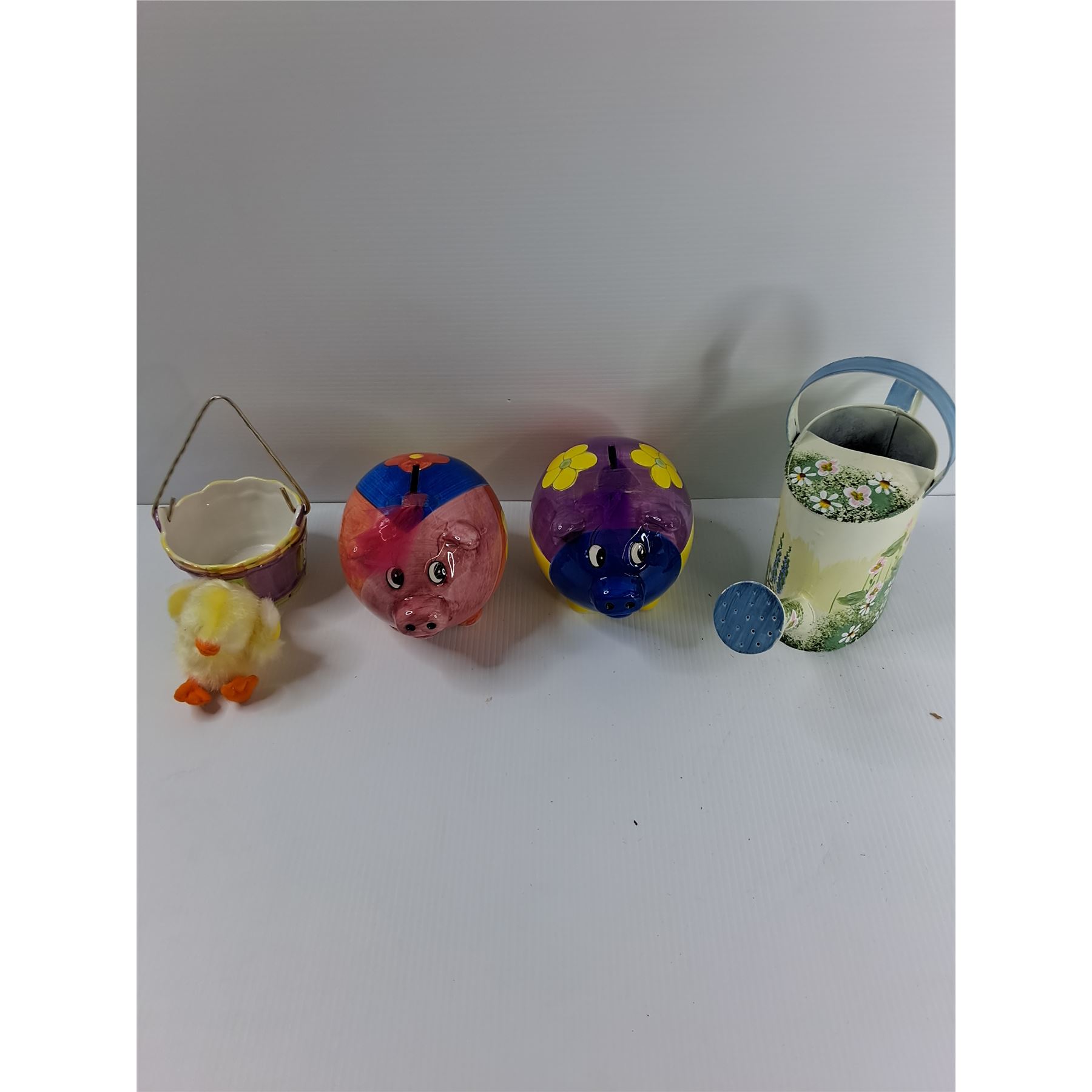 (2) Ceramic Piggy Banks,Metal Watering Can Decor Misc