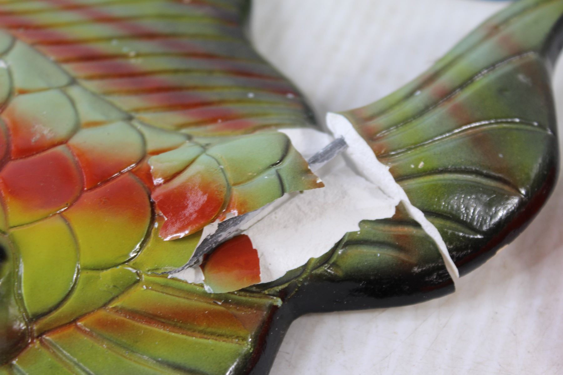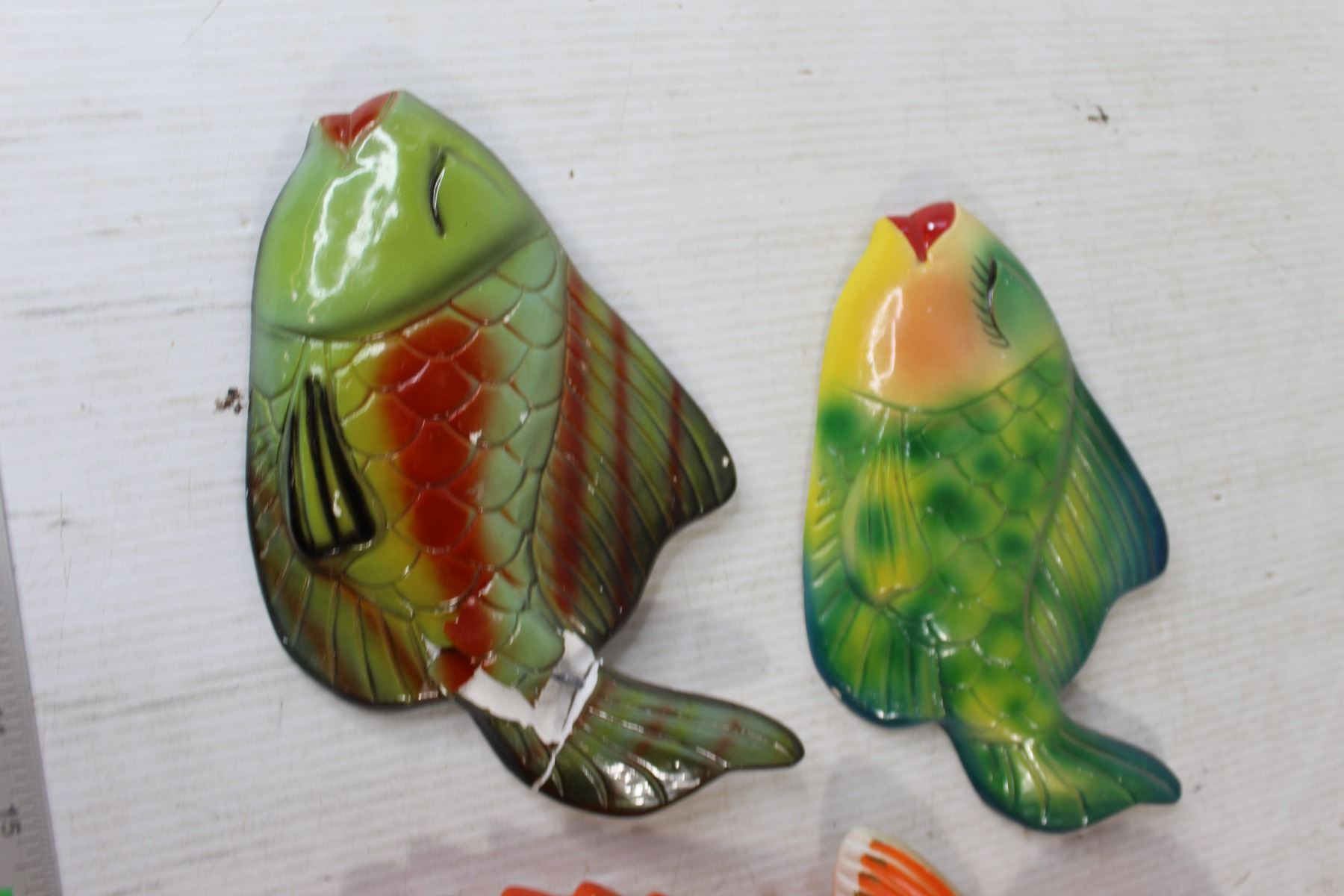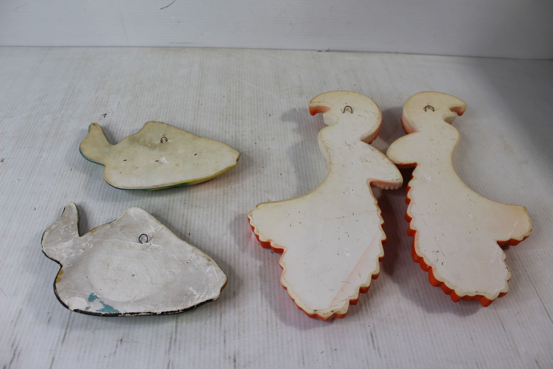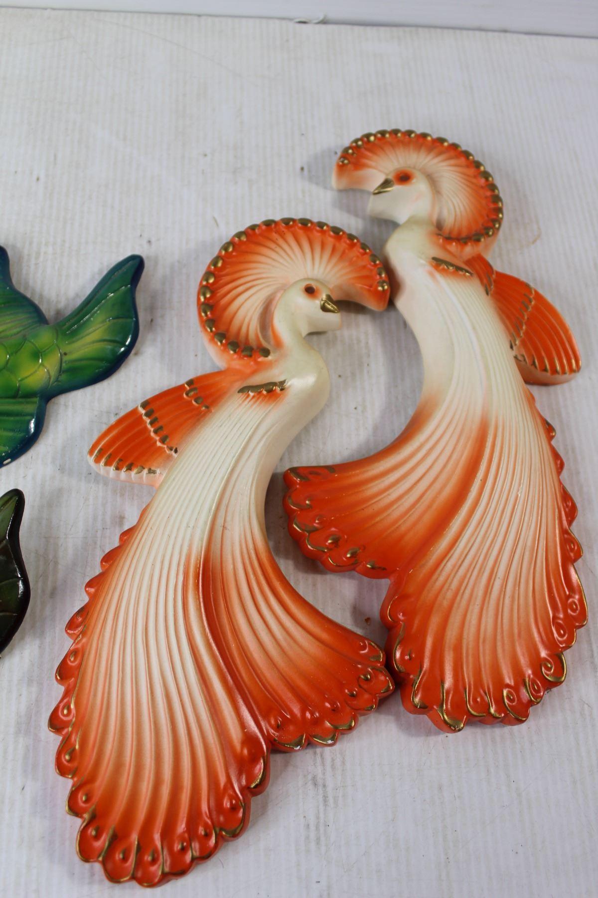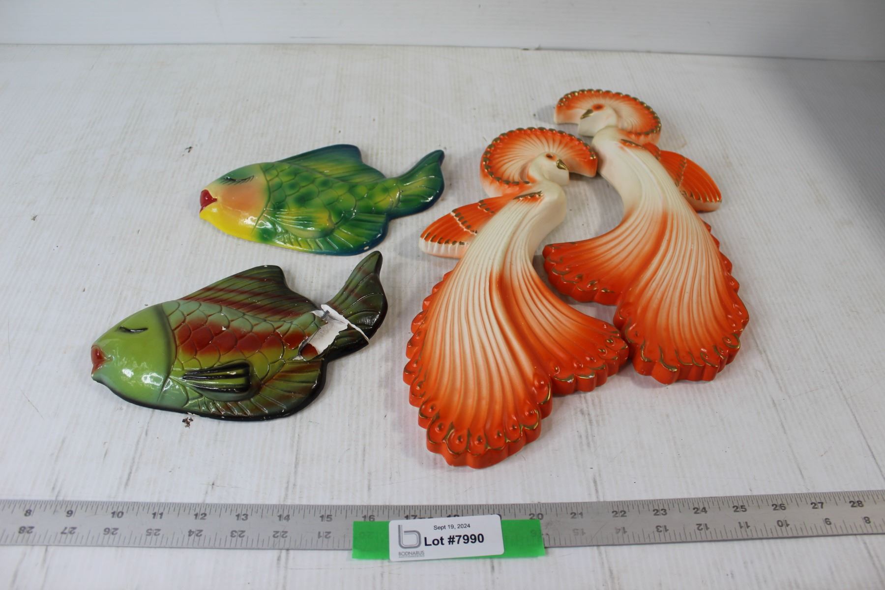(2) Chalkware Bird of Paradise Decorations, (2) Ceramic Fish Decorations(Broken Tail)