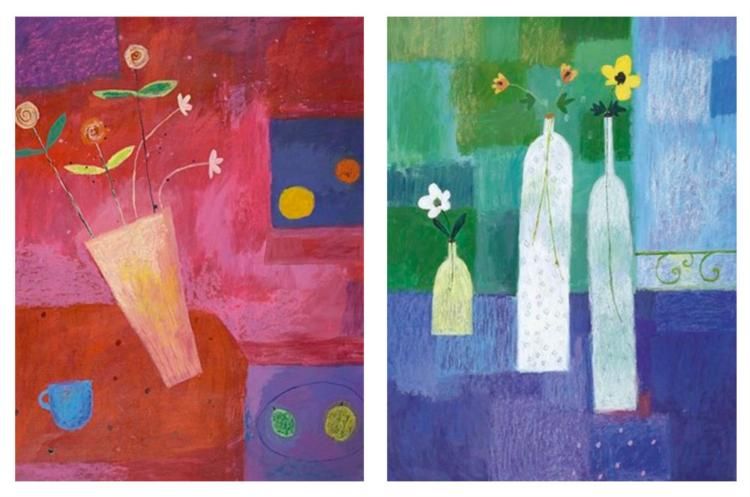 Artist: Charlotte HardyTitles: Floral Study in Red and Blue & Floral Study in Green and BlueMedium: PrintOverall size: 31 1/2" x 23 1/2"Overall condition: ExcellentBiography * Charlotte Hardy's work is essentially still lives of decorative objects. Charlotte is drawn * to pattern and colour, often from domestic interiors. She is trying to * convey the richness of her initial inspiration, simplifying the subject * matter to its most important elements. Her whole way of * working stems from universtity, where she would draw and paint collections * of ornamental objects, exploring playful compositions with a strong * design element. * * In the final artwork, acrylic paint is layered on top of patterned * papers to create textural surfaces. Charlotte also developed her passion for * drawing and mark making by creating a collection of screen prints. * Black line drawings from her sketchbooks have been translated onto * screen. The prints are in small editions and individually hand coloured * using inks and procion dyes. * *Information retrieved from artist website: http://www.charlottehardy.co.uk/about.php * *