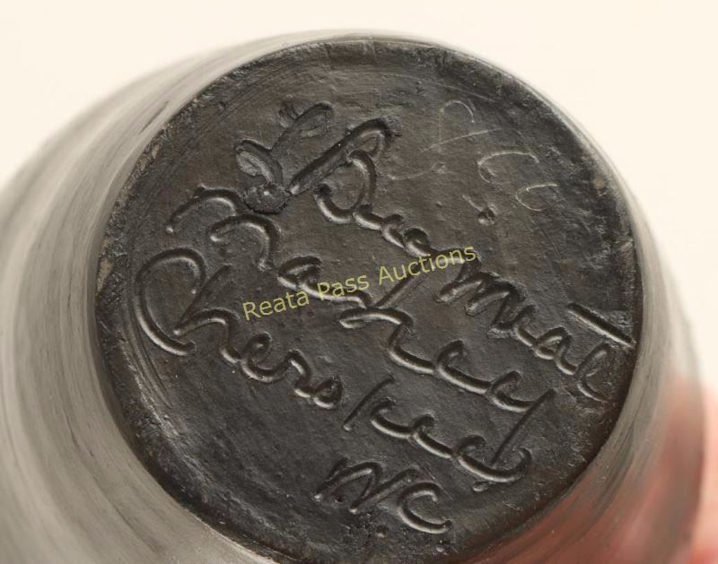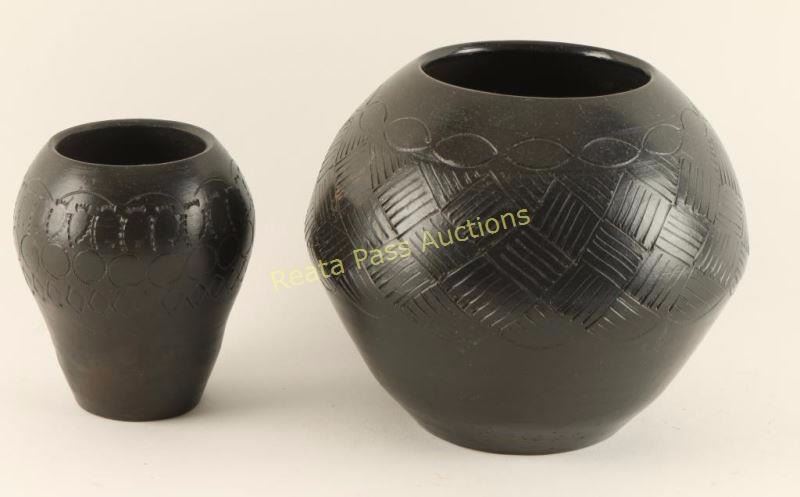 One with textured basketweave and oval design, measures 5 1/2"h and one with etched geometric designs measures 4"h x 3"dia. Both signed 'L. Biymeot Maney Cherokee NC' on base.