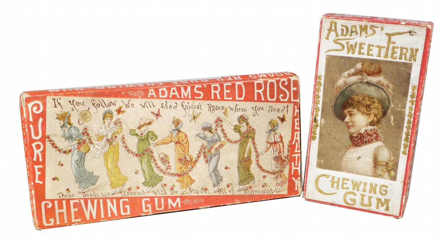 Lot of Two Chewing Gum Store Cardboard Display Boxes. Adams Sweet Fern and Adams Red Rose. Both show light wear with Red Rose box missing one end of it's lid otherwise good condition. Large one measures 12 1/2 X 1 X 6 inches.