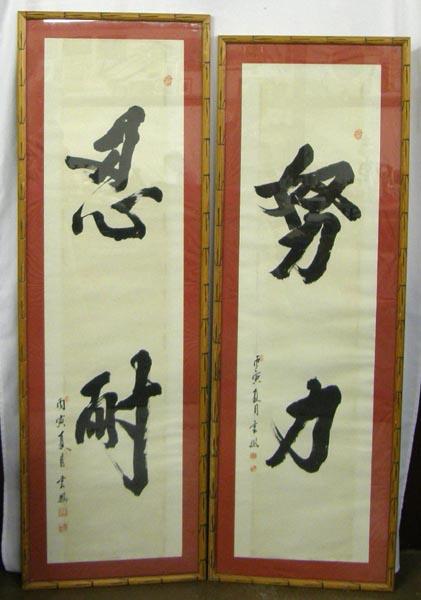 2 China Scroll Paintings. One measures approx. 13'' x 52'' and the other measures approx. 13'' x 48''. Framed in wood frames, under glass. Some paper in frame is warped. MUST BE PICKED UP!
