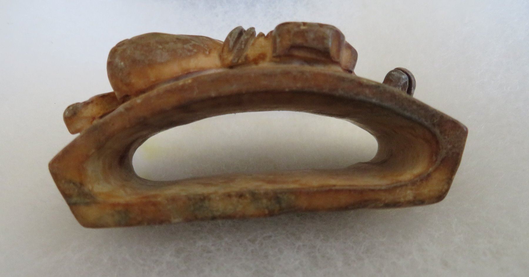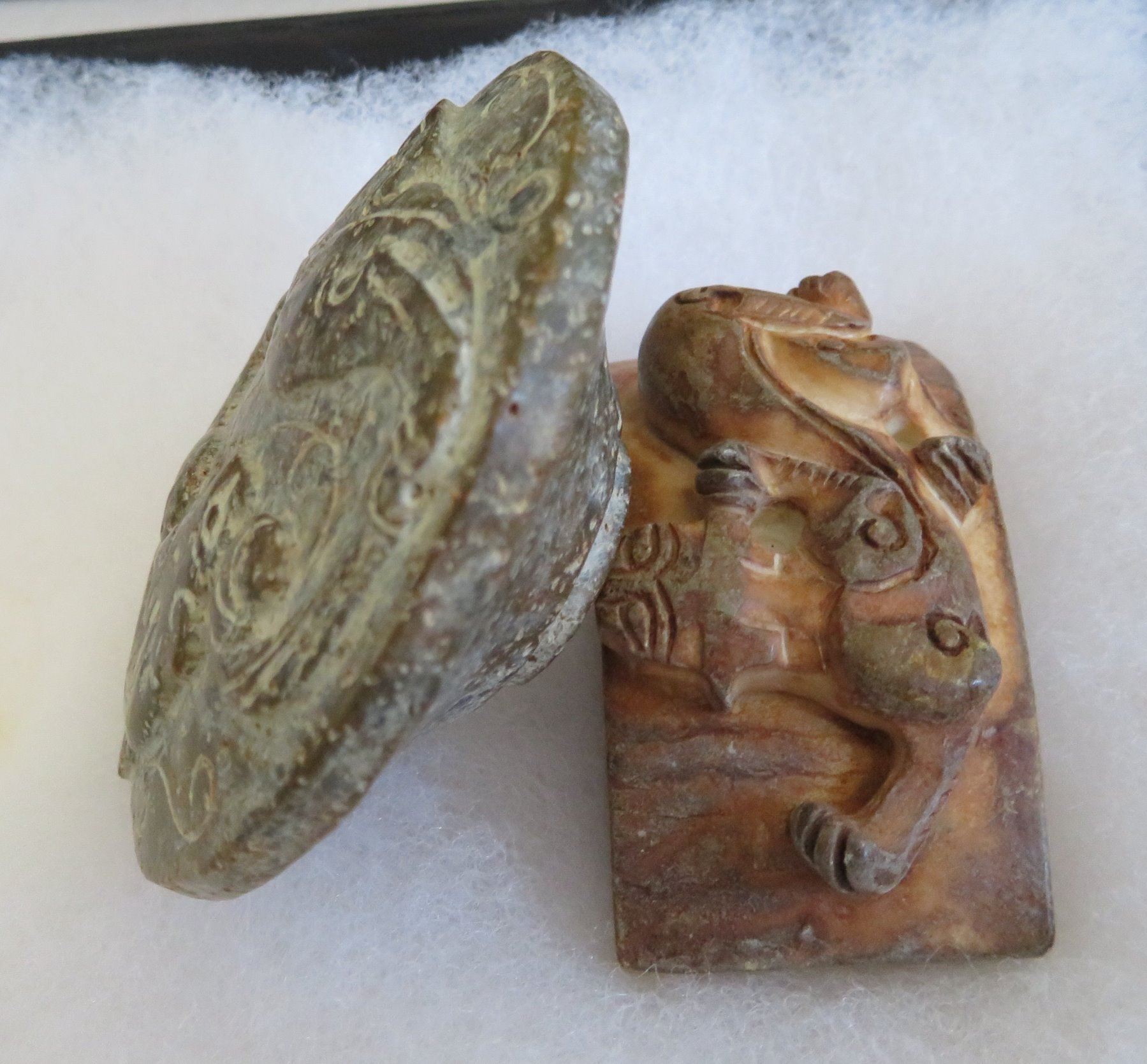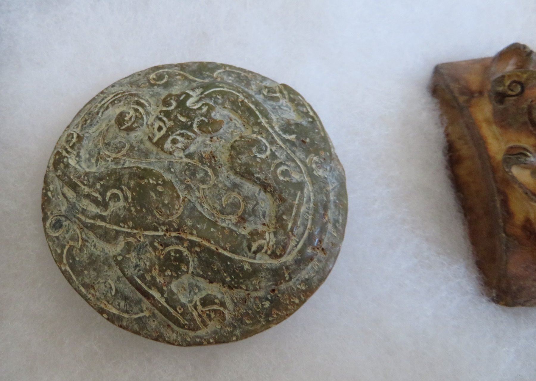 2 Belt Buckles, Zhou dynasty. Made of jade, the items measure 2 1/2" each. China. Figures on buckles. Condition: Good, see images. Shipping: $26.50 w/insurance and signature, due to value.