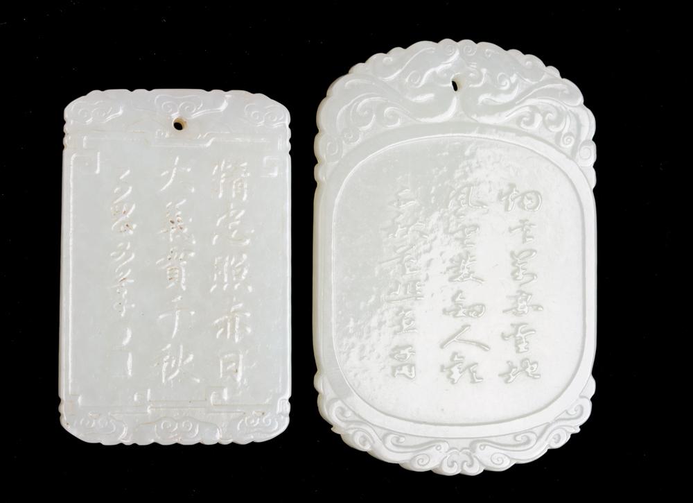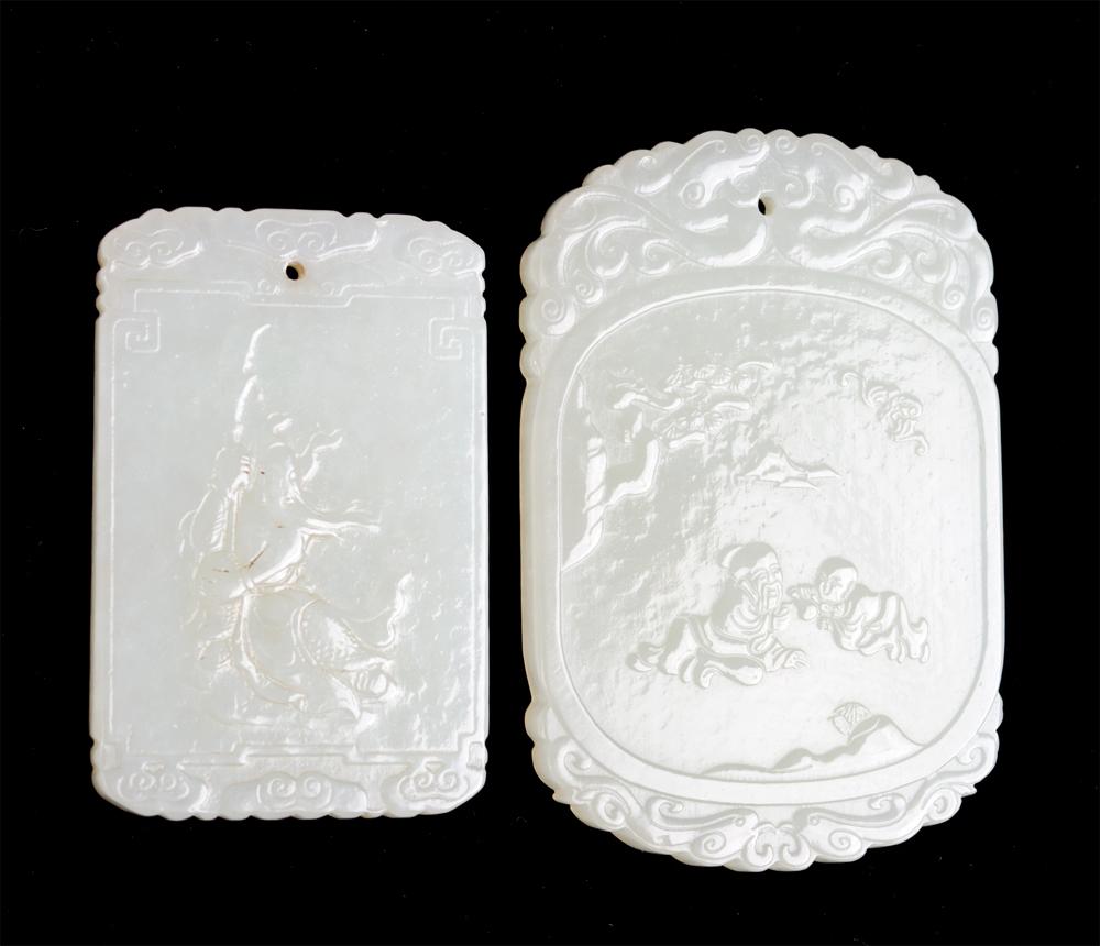 One finely carved to depict little boys amongst ruyi clouds the reverse with calligraphy one carved to depict a warrior the reverse with calligraphy both fine polish and well carved largest is 2.125"H X 1.374"W circa 20th century.