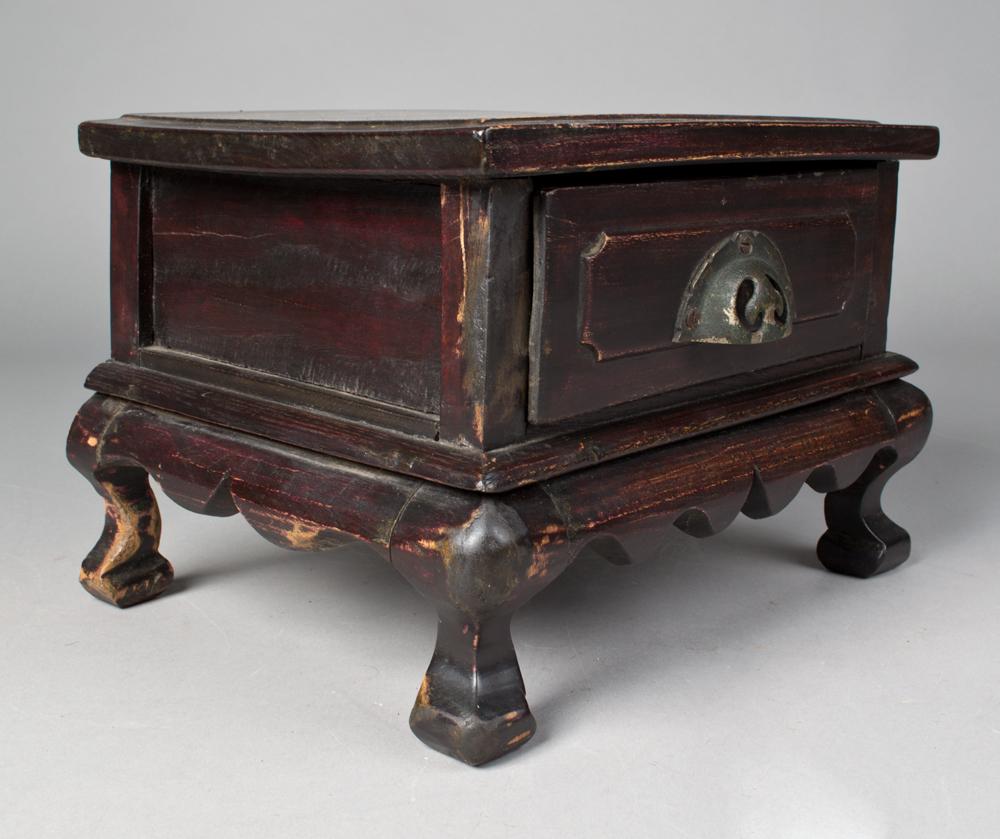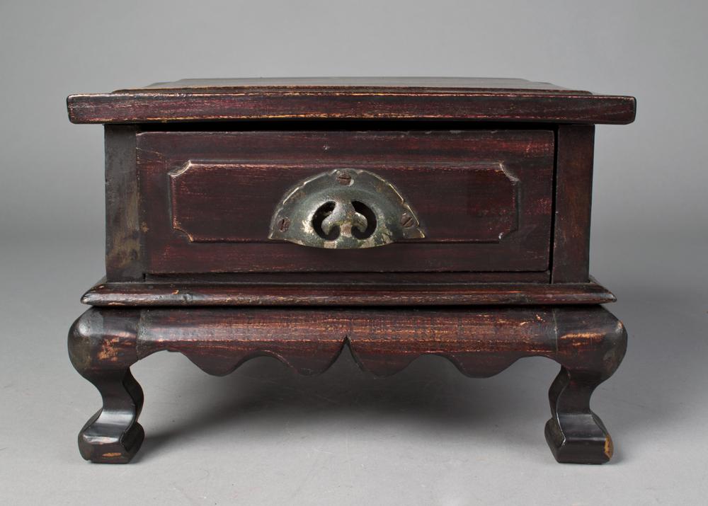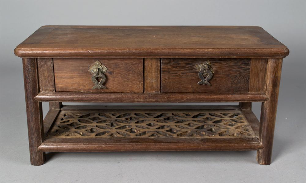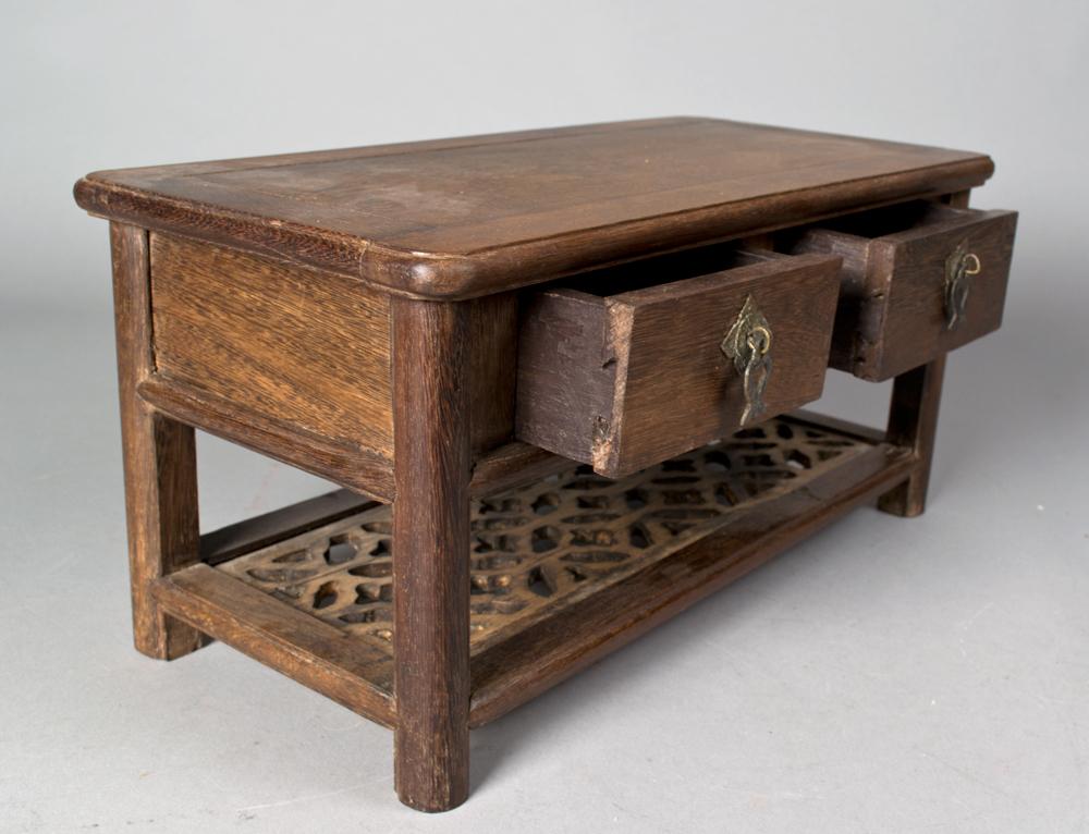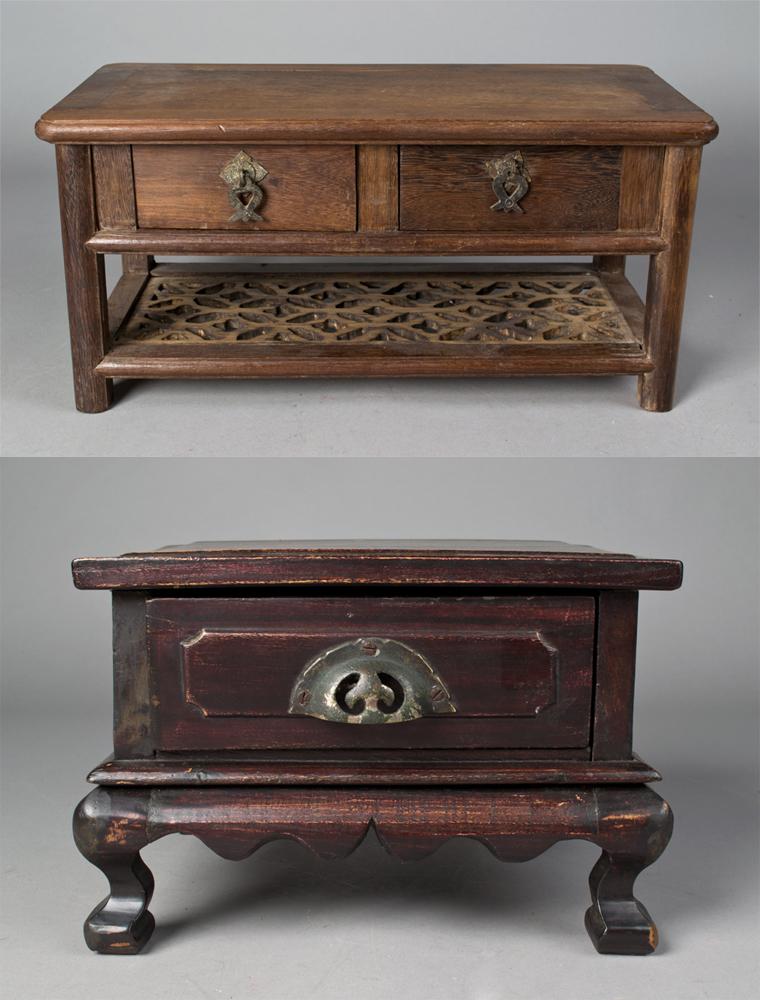 Includes a two drawer box raised on four feet with lower shelf carved with scrolling openwork. Together with a single drawer box raised on four feet and in a dark stain. Largest 8" H x 16" W x 8" D. Circa early 20th century.