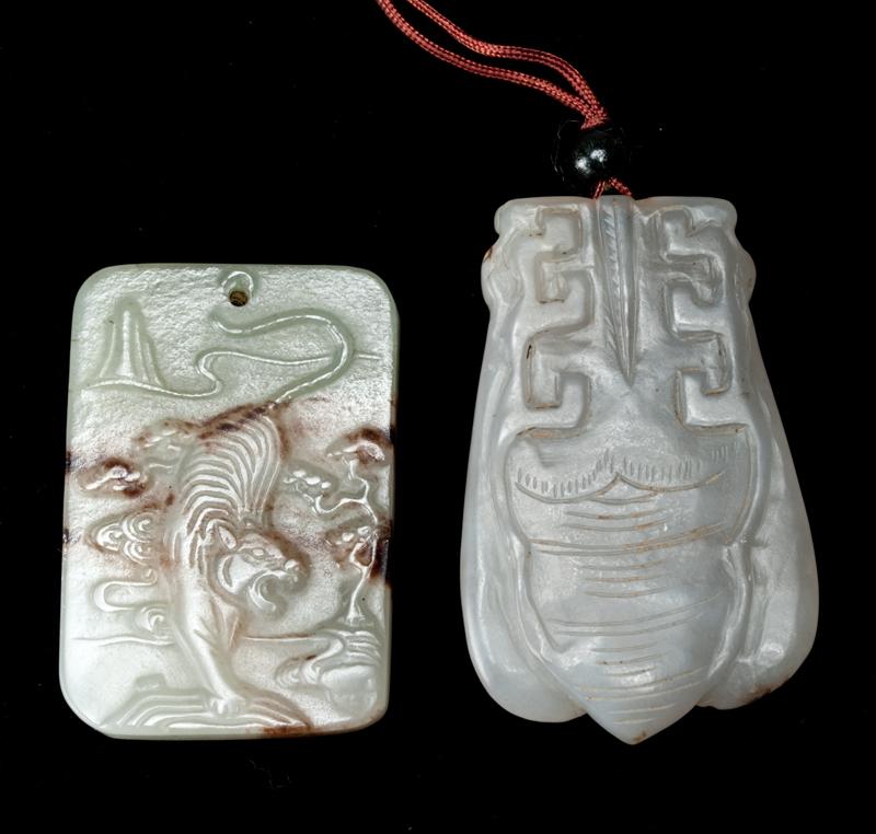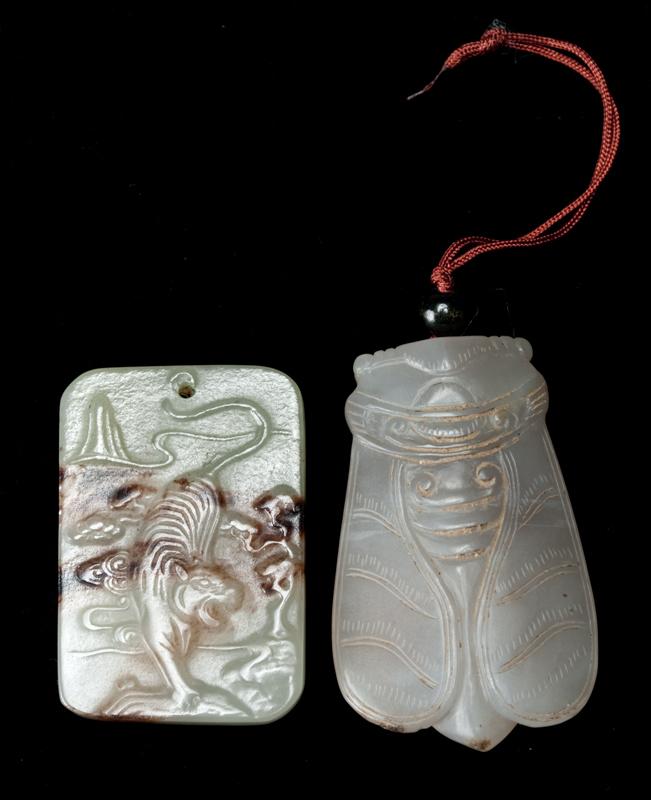 To include a cicada finely carved on both sides with hanging apparatus and black bead, 2.25"L. together with a rectangular in light and medium celadon, finely carved on both sides to depict a tiger, 2.125"L.