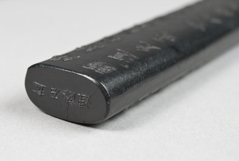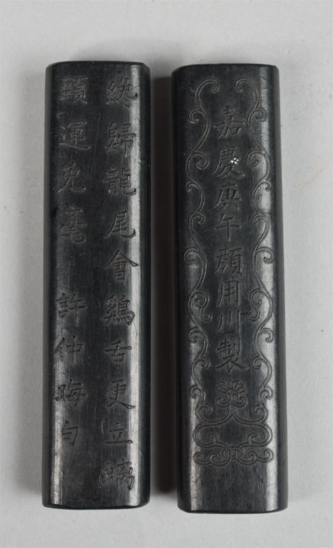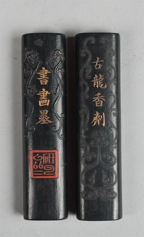 One side carved with calligraphy within a scrolled border, other side with calligraphy highlighted in gilt. One chop with carved seal mark within a red border. 4.375" H, circa 20th century.