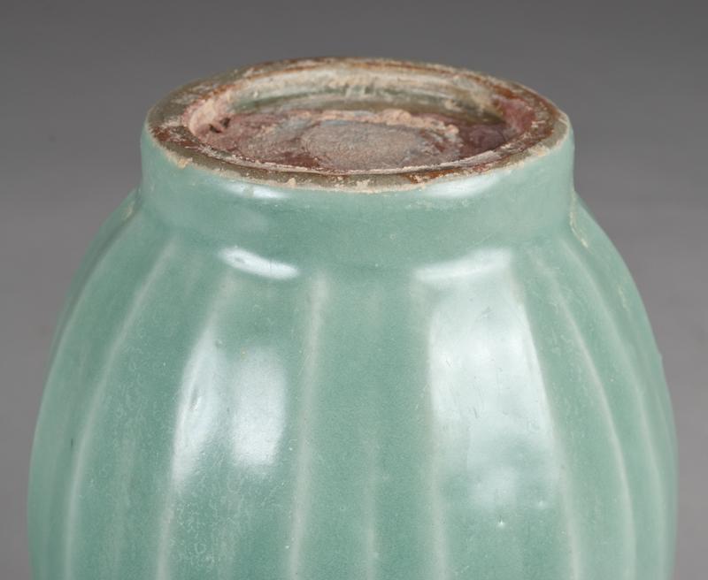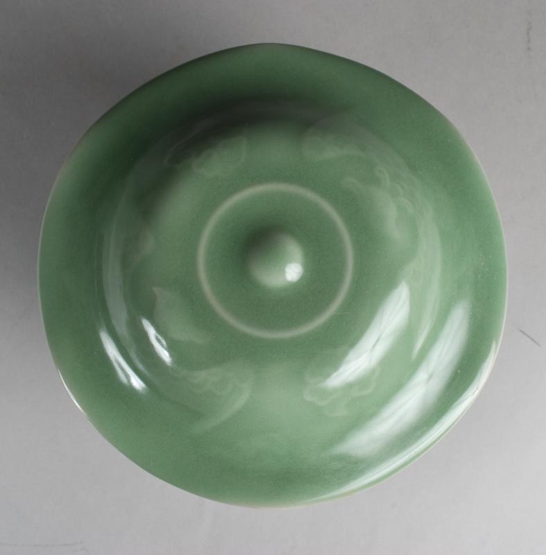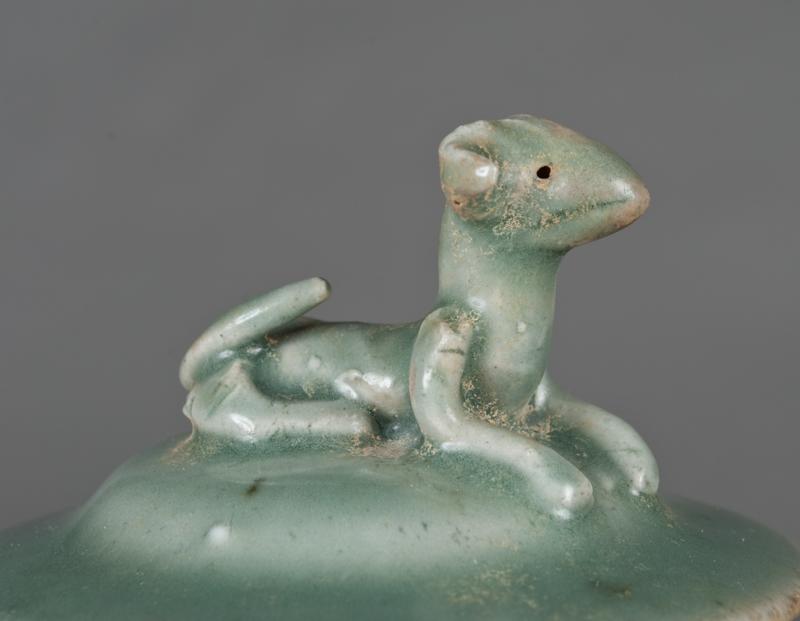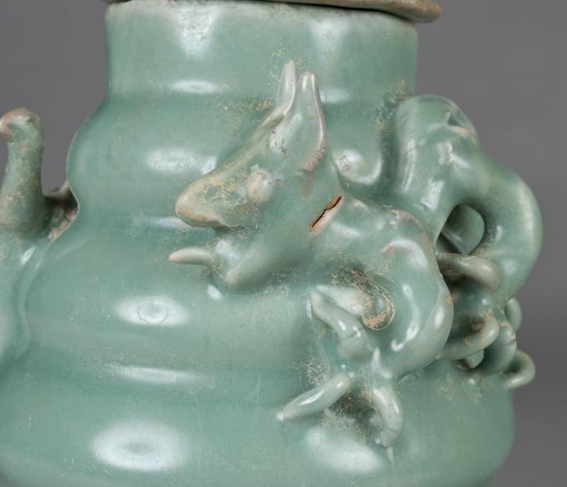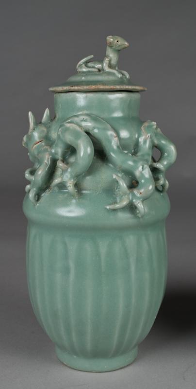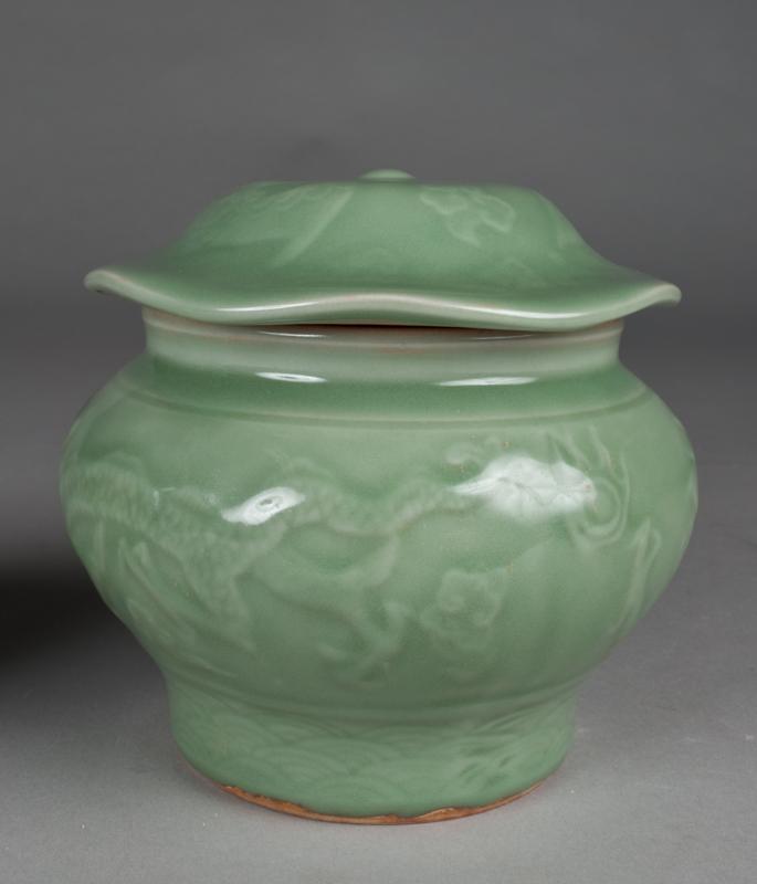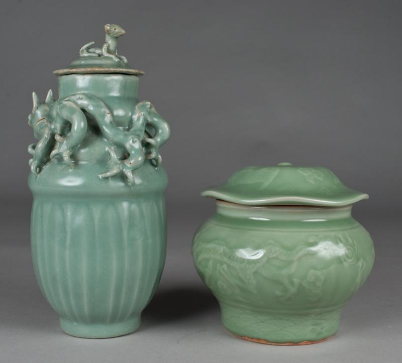 To include a large covered temple style jar with raised decorations to include a coiled dragon around the body, a seated ram on the lid and a bird on the reverse of the body, together with a celadon glazed covered lotus jar with molded dragon and scalloped lid, tallest is 10.625"H.