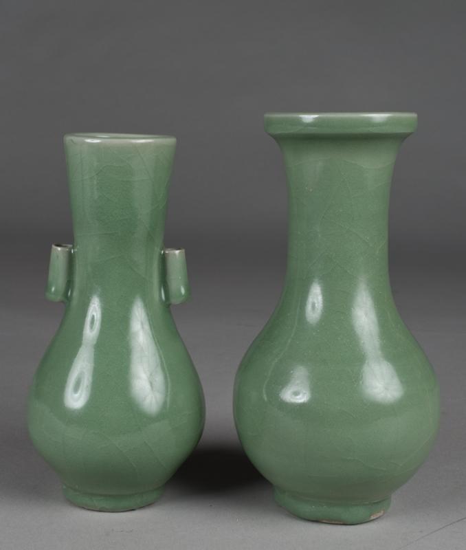 One with two lug handles and footed base, together with a larger vase of bulbous vase and open mouth, both with a green celadon slightly crackled glaze, tallest 7.5"H.