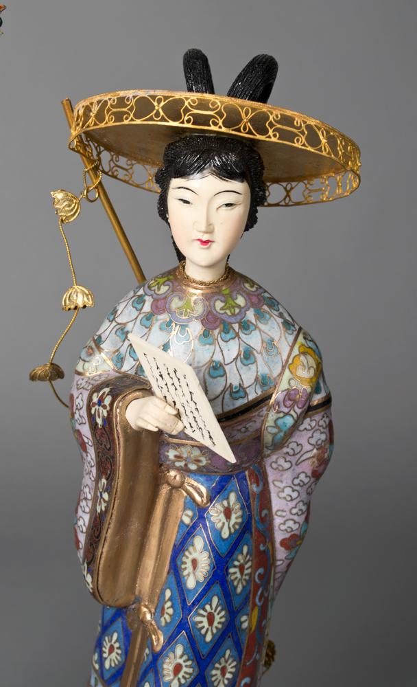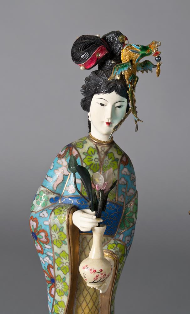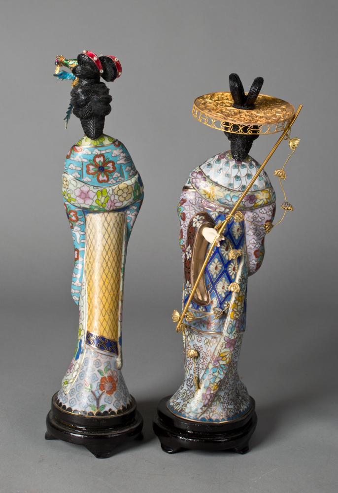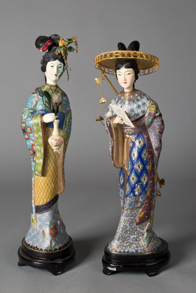 Finely enameled to depict beauties one holding a vase of hardstone flowers the other holding a tablet both on fitted wood stands 13.5"H circa 20th century.
