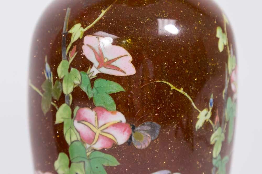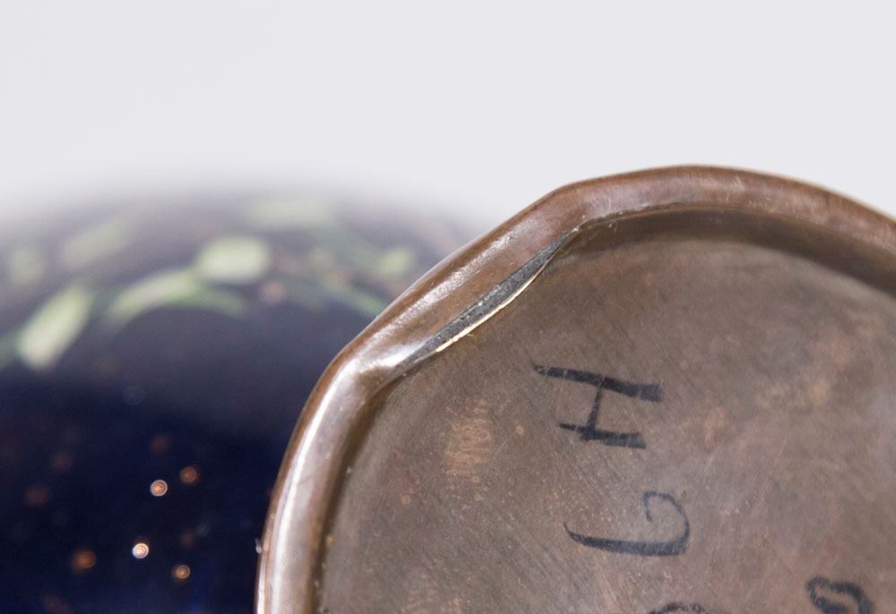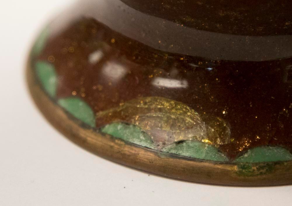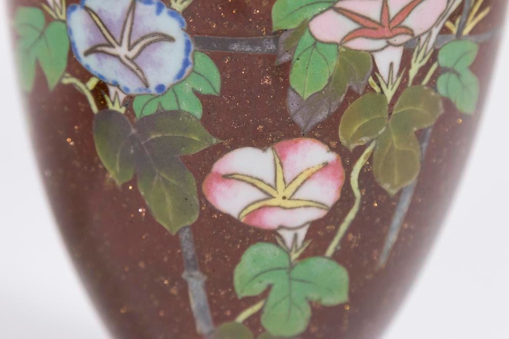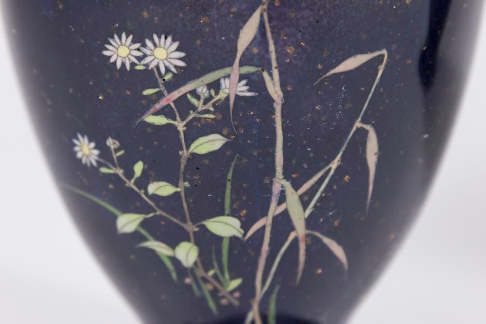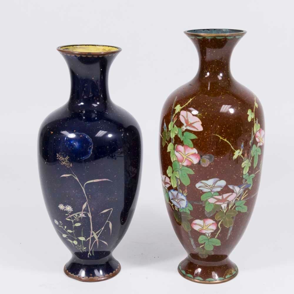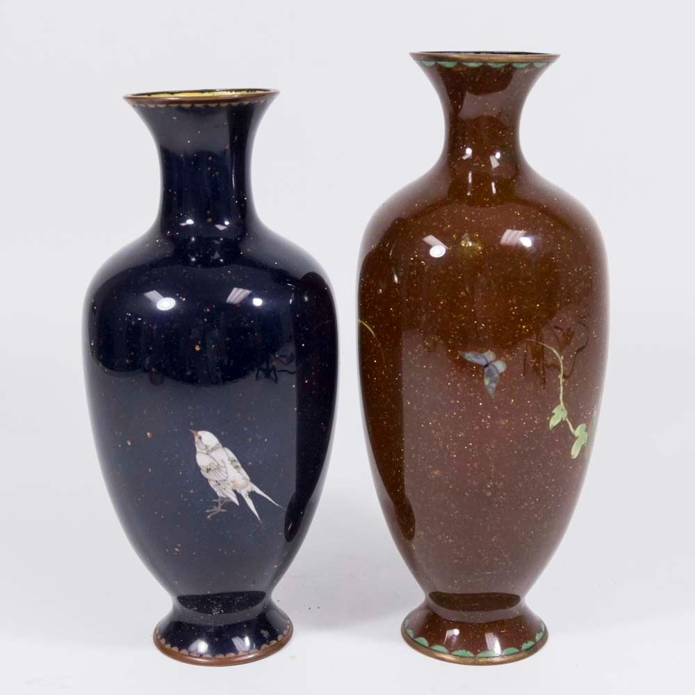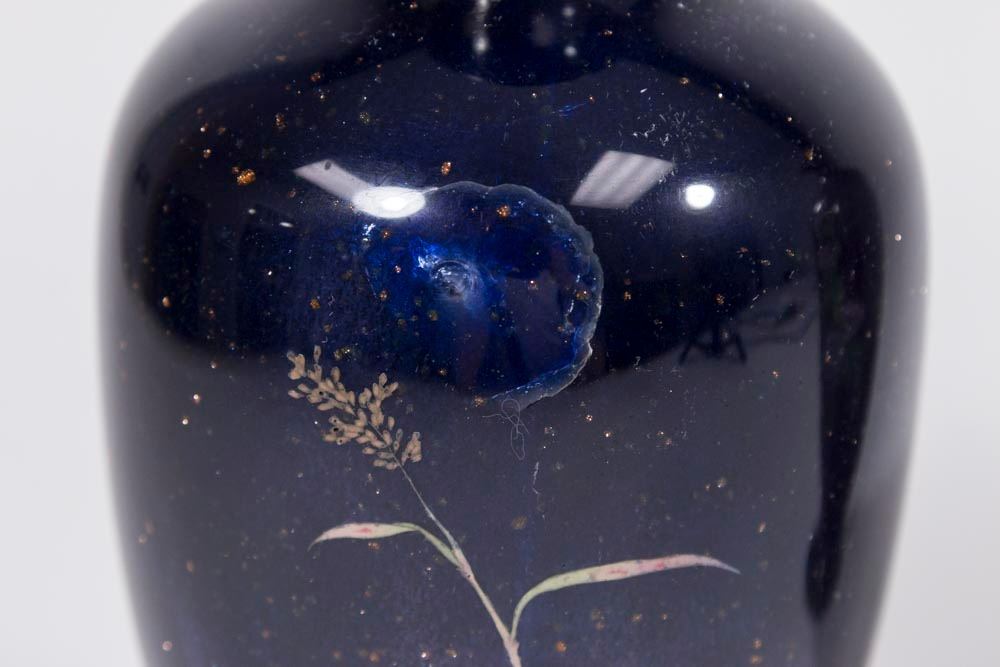 With gold dust floral design. Approx. 11 1/2" H. From a Manhattan estate. Rust one has damage on base. Blue one with dent to base. Both have small dings.