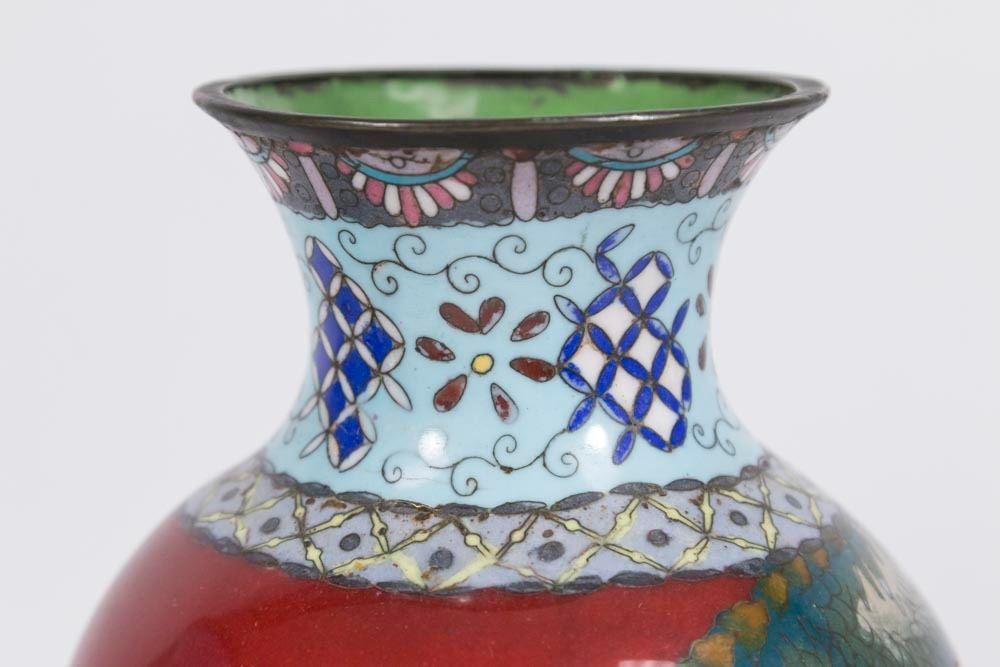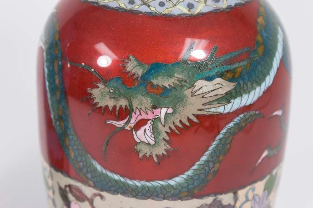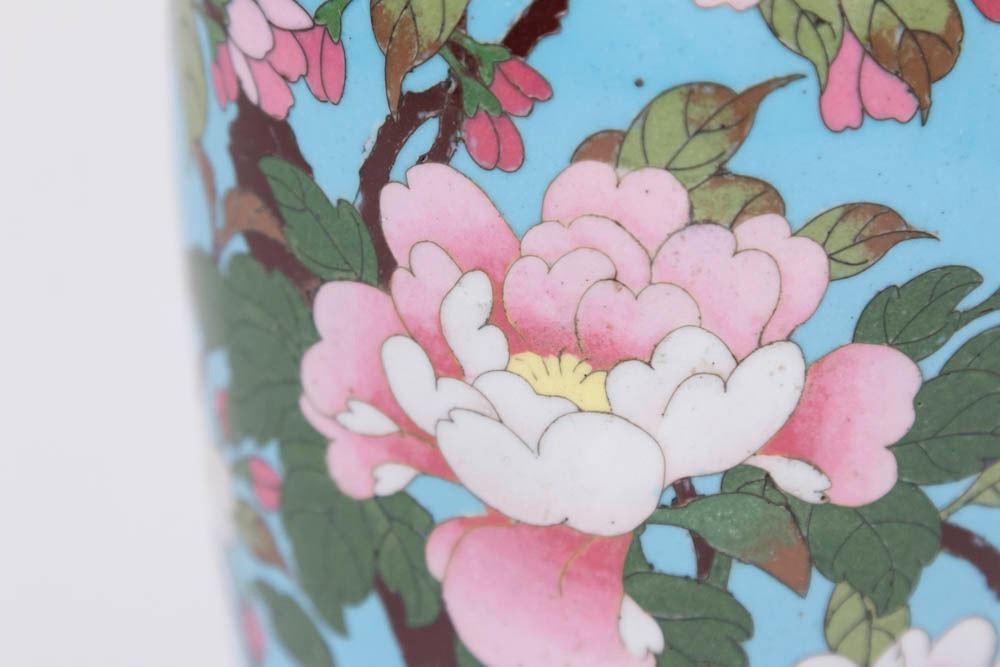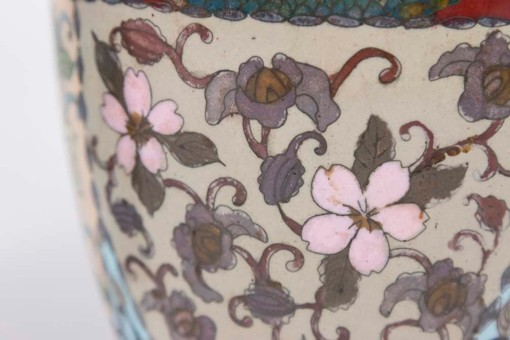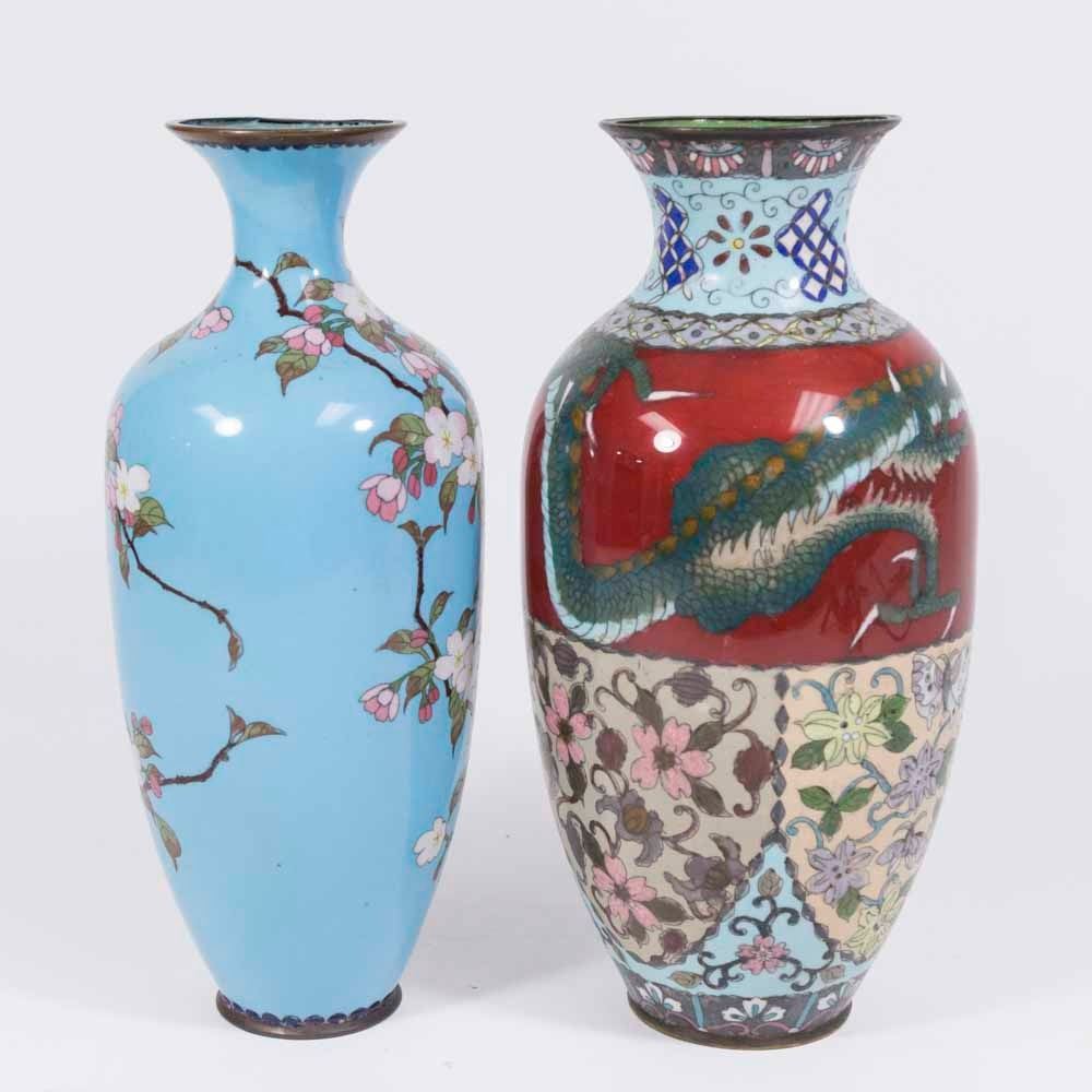 1 floral with blue background. 1 dragon and floral design. Both approx. 12" H. From a Manhattan estate. Vase with blue background has damage to inner rim.