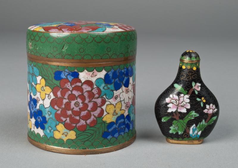Includes a covered jar with peony and floral designs throughout, China in red on underside. Together with a small snuff bottle in black with pink peonies, bird and butterfly. Largest 3 & 1/8" H. 20th century.